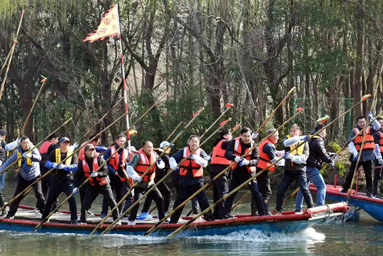传承800年的姜堰会船文化持续创新,2024年,首次以规范的体育赛事组织竞技,成为姜堰地标性群众特色体育项目。每年四月的溱湖,“溱潼会船节”如约而至,数百艘船只齐聚湖面,篙船如箭、划船似龙,游客不仅可沉浸式感受“世界最大水上庙会”的磅礴气势,还能参与水上非遗展演、民俗巡游等活动。