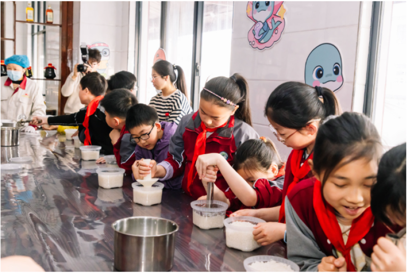活动中,孩子和家长们一同走进魏村街道“渡江一号”馆,聆听革命故事与“老寄娘”邹兰英的英勇事迹,有序敬献鲜花、发起倡议,传承英雄精神;在光大常高新环保能源公司,直观感受垃圾焚烧发电实景,系统掌握垃圾分类技巧,深刻领悟绿色发展的重要意义。在非遗酿酒技艺体验环节,孩子们不仅深入了解了传统酿酒文化的发展脉络与精湛工艺,还亲手参与了酒酿制作。大家围在操作台旁,挽起袖子、洗净双手,在酿酒师傅的细致指导下,将预先蒸熟、拌好酒曲的糯米放进碗中,小心翼翼地压实、掏洞。不时有孩子凑到碗边轻嗅,好奇地询问“什么时候才能酿好”,“把做好的甜酒酿带回家,常温下放置三四天,等到酒液没过米粒就可以品尝了。”酿酒师傅通俗易懂的讲解,让孩子们真切感受到了古法酿酒的奇妙乐趣。