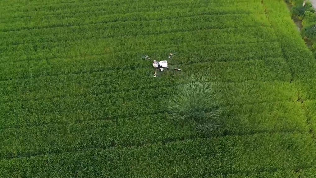 在杭州市萧山区义桥镇的皇天畈麦田,连片麦田长势喜人。现场,无人机正在开展小麦病虫害防治作业。