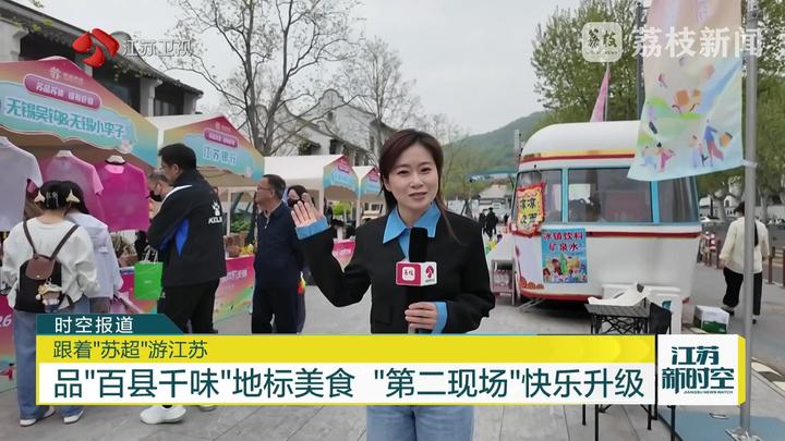 荔枝新闻中心记者周婕说:“这里是无锡惠山古镇的映月里文化商业街区,户外的大屏已经准备,今晚会同步直播‘苏超’首轮无锡队主场迎战镇江队的比赛。现场同时还有‘百县千味’的美食市集,有无锡酱排骨、樱花绿豆糕,还有惠山酥油饼,可以说是满满的无锡味道。在这既能看比赛,还能吃美食,还有好多的超多江苏好物可以买。”
