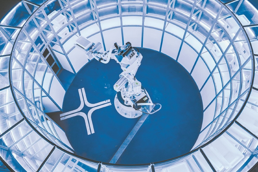 张江机器人谷内,ABB的机器人手臂操作演示。 视觉中国