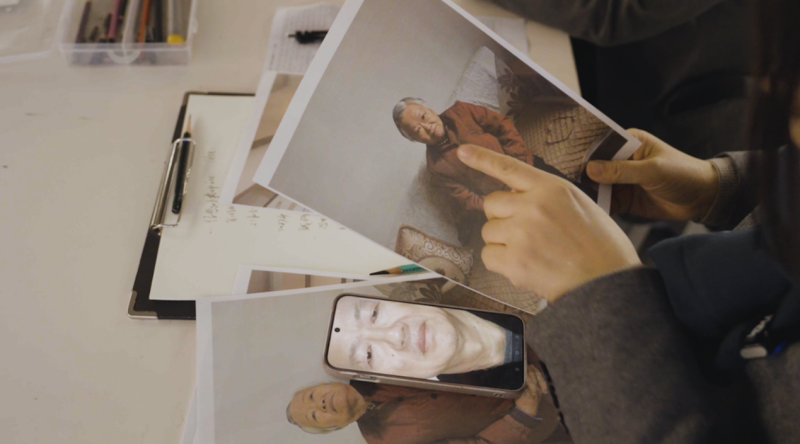 师生们决定与钱秀娟进行视频连线。第一次通话时,屏幕那头的钱秀娟老人表情凝重,眉头紧锁——老人担心,仅仅靠她的描述,师生们能不能真的画出叔叔的模样。