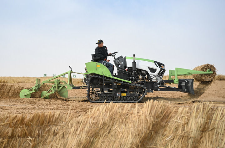 2026年2月28日,工人在内蒙古阿拉善盟境内的乌兰布和沙漠驾驶小型履带沙障机作业。新华社记者 贝赫 摄