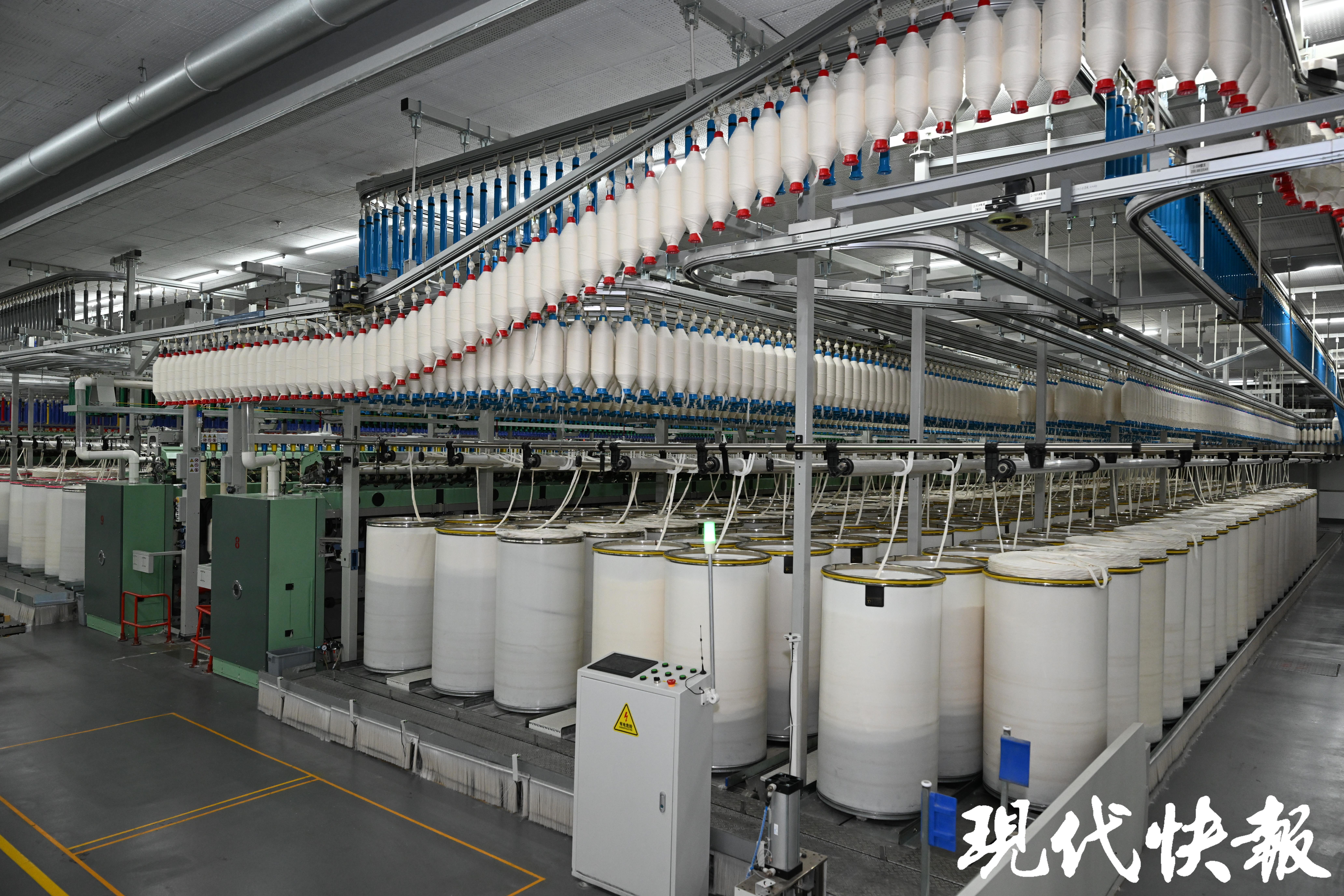 4月25日上午,媒体嘉宾来到位于盐都区的江苏悦达纺织集团有限公司。刚走进10万锭绿色智能工厂,大家就被眼前的景象吸引:5万平方米的车间内整洁有序,一排排智能纺纱设备规律运转,AGV运输机器人沿着32公里智能传输线来回穿梭,银纱飞舞间,空纱管被自动回收,满筒纱线被精准送达。