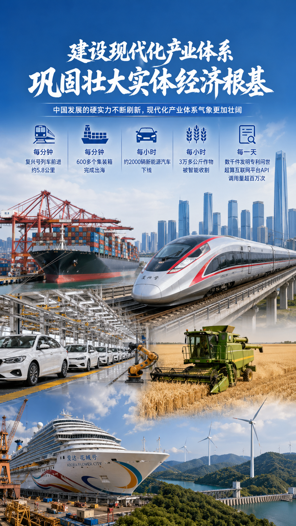 每分钟,复兴号列车前进约5.8公里,600多个集装箱完成出海;每小时,约2000辆新能源汽车下线,3万多公斤作物被智能收割;每一天,数千件发明专利问世,国家超算互联网平台应用程序编程接口调用量超百万次……依托全球最大最完备产业体系,中国发展脚步坚实有力。