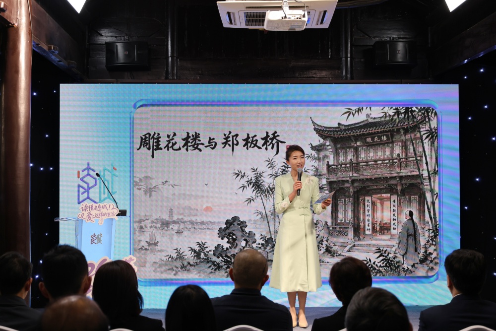 现场6位领读者的串烧讲述,为观众带来了他们心中最珍贵的“我城”故事。“我为大家领读泰州的雕花楼。相传当年郑板桥辞官返乡,途经柴墟口岸时盘缠耗尽,雕花楼主人留他一夜,两人相见如故,彻夜长谈,兴之所至,郑板桥挥毫书写对联‘书从疑处翻成悟,文到穷时自有神’,并即兴创作了一幅《竹石图》,如今这幅字画就挂在雕花楼的前厅……”领读者娓娓道来。