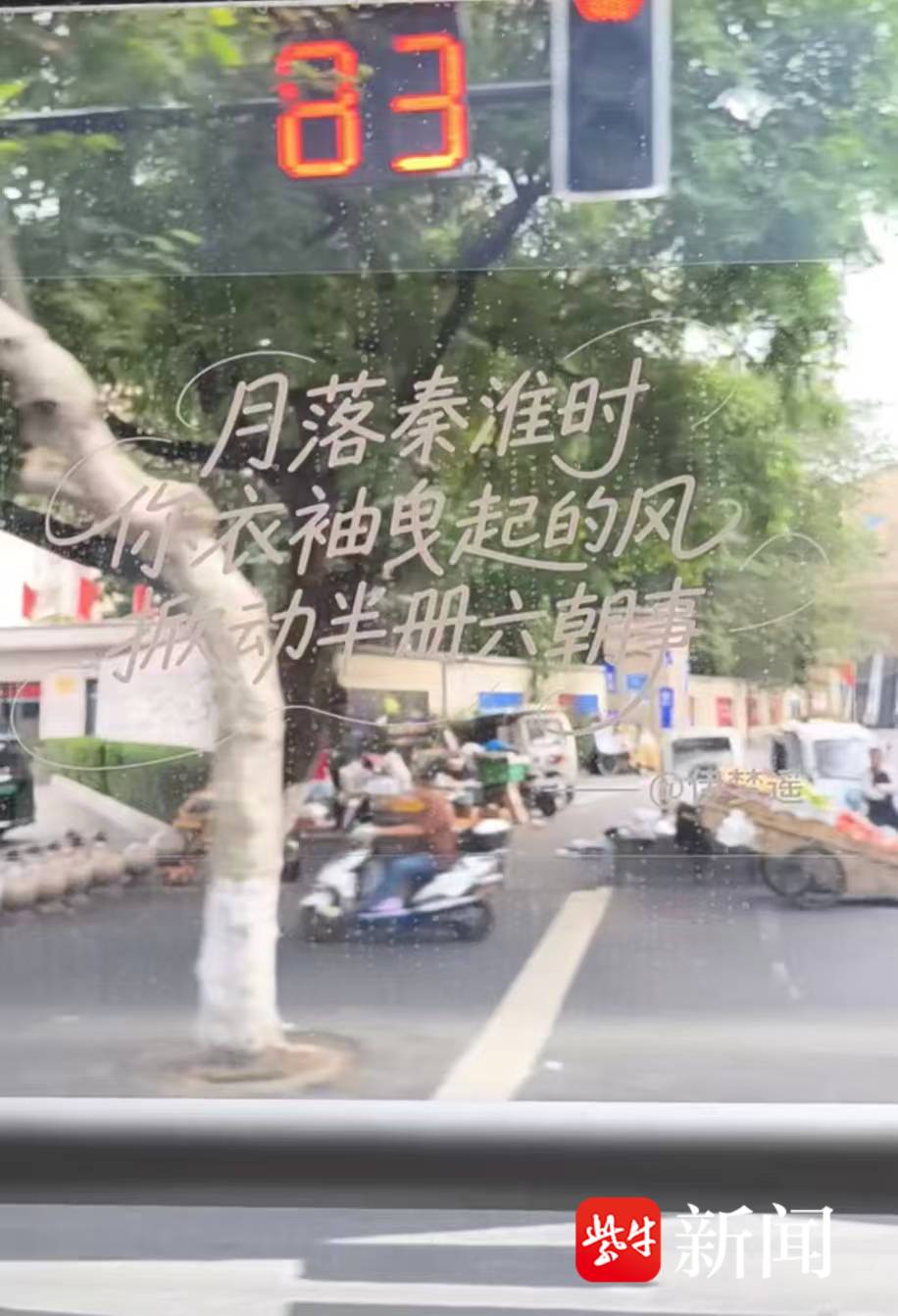 “月落秦淮时,你衣袖曳起的风掀动半册六朝事”“风把云揉成你的名字,我在每片落叶上写诗,落款是我心跳的地址”……在车窗上,还能看到一些网友对南京的感悟。车辆行驶中,这些文字映衬在车窗外道路两旁的梧桐树上,记录下一种独属于南京的诗意。