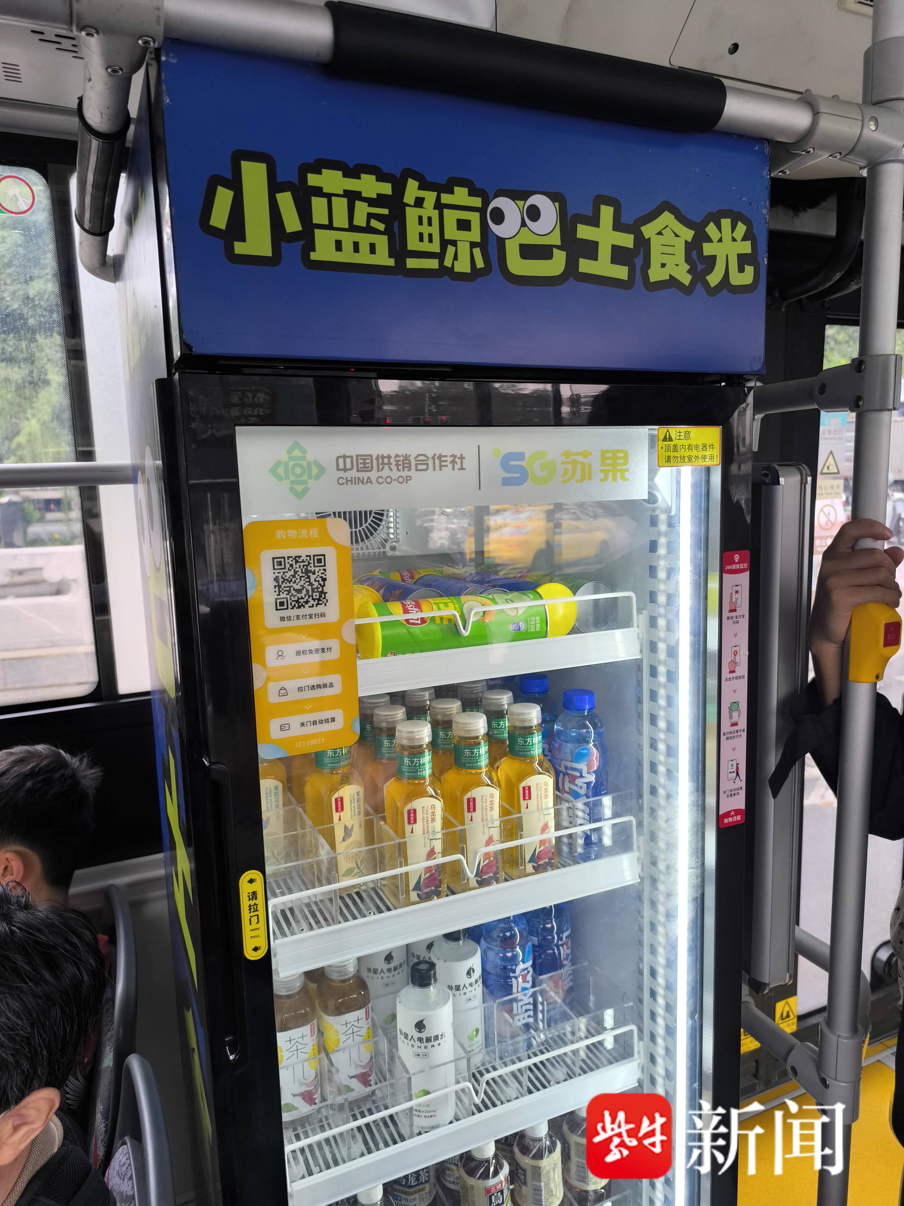 扬子晚报紫牛新闻记者看到,在车厢后门旁的“小蓝鲸巴士食光”自助售货机中,摆放有多款茶、运动等瓶装饮料,此外还有瓶装纯净水和各种味道的薯片等零食。通过手机扫码操作,就可以支付购买,操作非常方便。