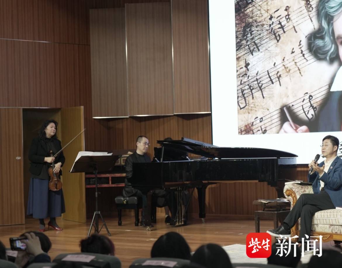 11月8日,围绕美国著名音乐学者马克·埃文·邦兹教授撰写、中国音乐家协会副主席、中国音协西方音乐学会会长杨燕迪作序的牛津通识读本《贝多芬》,杨燕迪来到南京艺术学院闳约大讲坛,与师生们一同走进贝多芬的音乐世界,开启了一场关于经典、青春与生命的深度对话。本次活动由南京艺术学院、译林出版社联合主办,南京艺术学院盛小华教授担任主持人与小提琴演奏,南京艺术学院教师陆师阳担任钢琴演奏,在现场为师生们带来贝多芬的经典旋律。