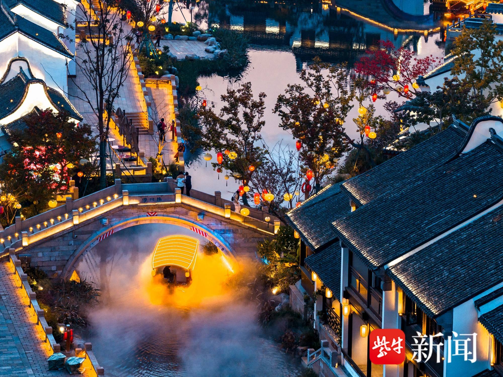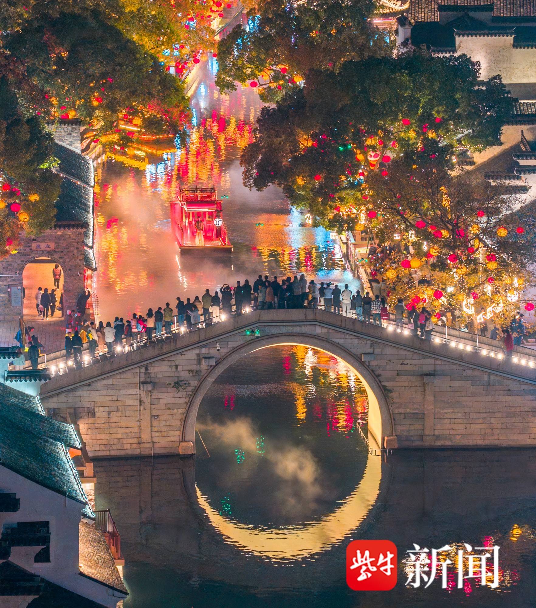 暮色初临,灯笼次第亮起。灯光透过桥洞洒在水面,碎成点点金粼,与空中航拍的镜头呼应,分不清是秋光醉了人,还是人入了秋画。春晚的热闹刚刚散了,可映月里的好景致才刚到最有味道的时候。”