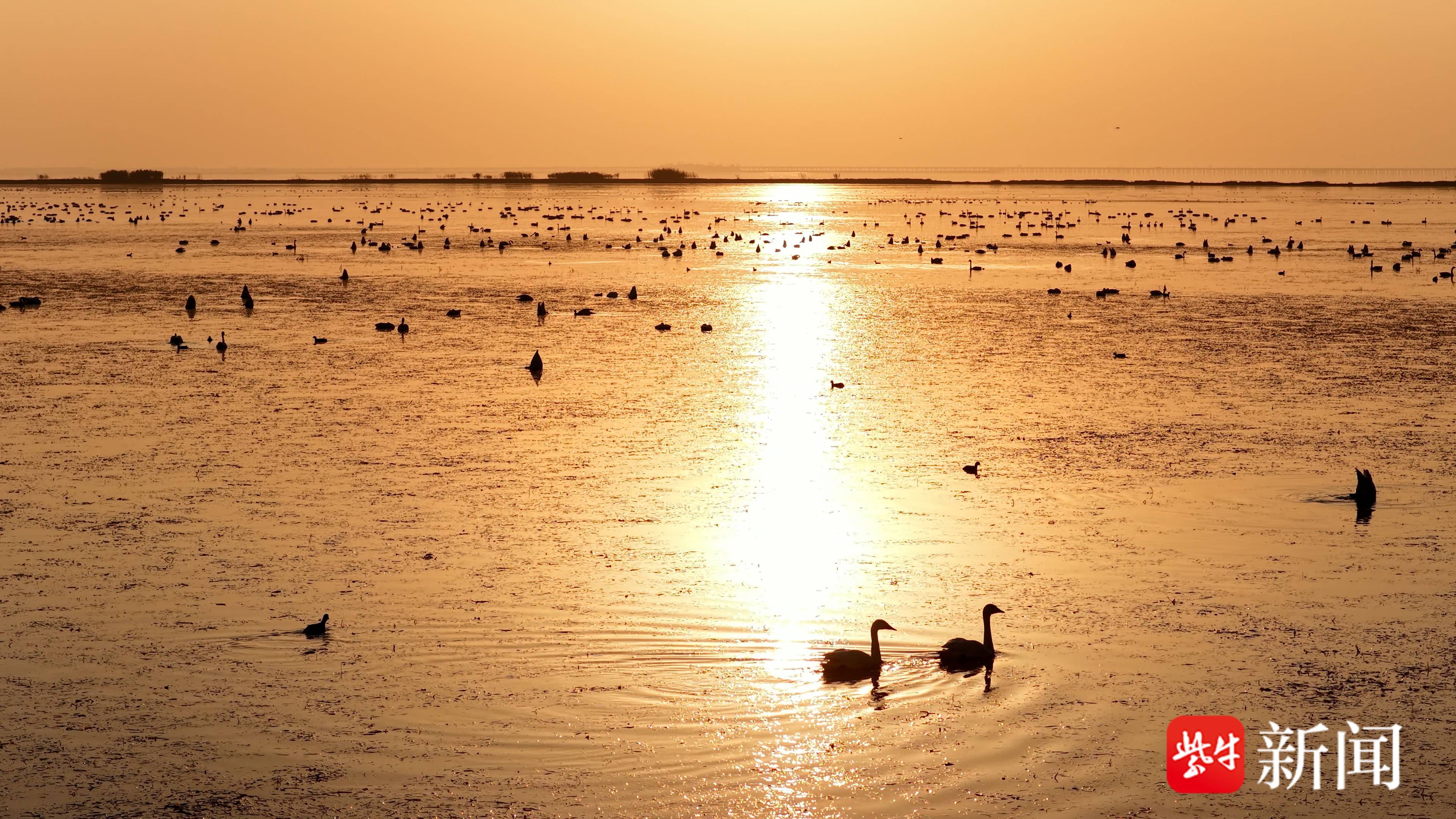 日落时分,绚烂晚霞铺满天空,金色余晖洒向湖面,雪白的天鹅宛如跳动的音符,引得不少摄影爱好者和游客前来观赏、记录美景。