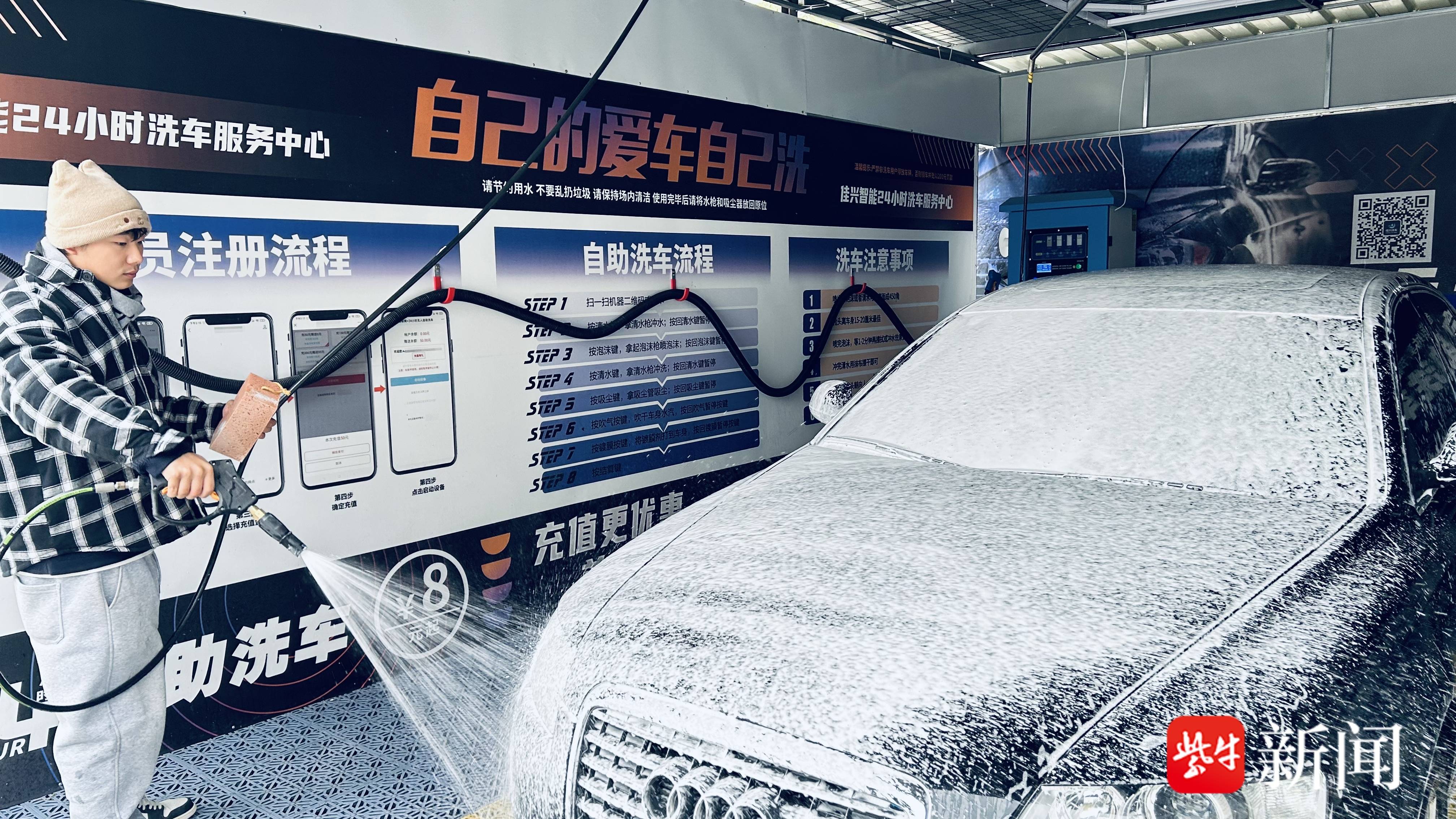 在鼓楼区金基翠城三期停车场的自助洗车点,记者看到,车主将车辆驶入指定区域后,扫描屏幕二维码即可启动洗车程序。系统依次进行清水冲洗、泡沫喷洒、二次冲洗,全程仅需十分钟左右。站点还贴心地配备了专业洗车工具和大小抹布,方便车主进行精细化处理。在该站点,首次使用的用户还可享受免费体验服务。