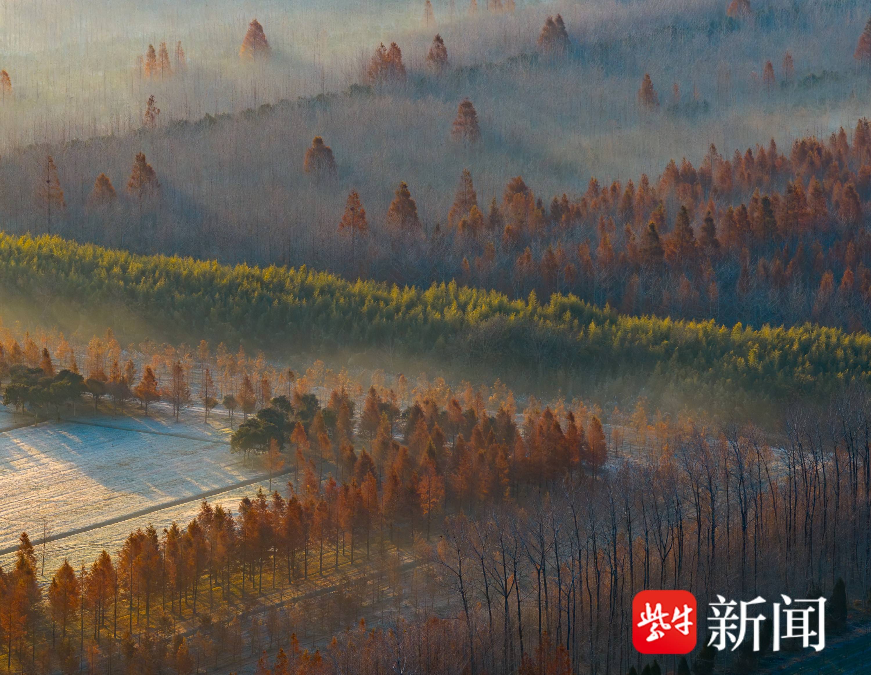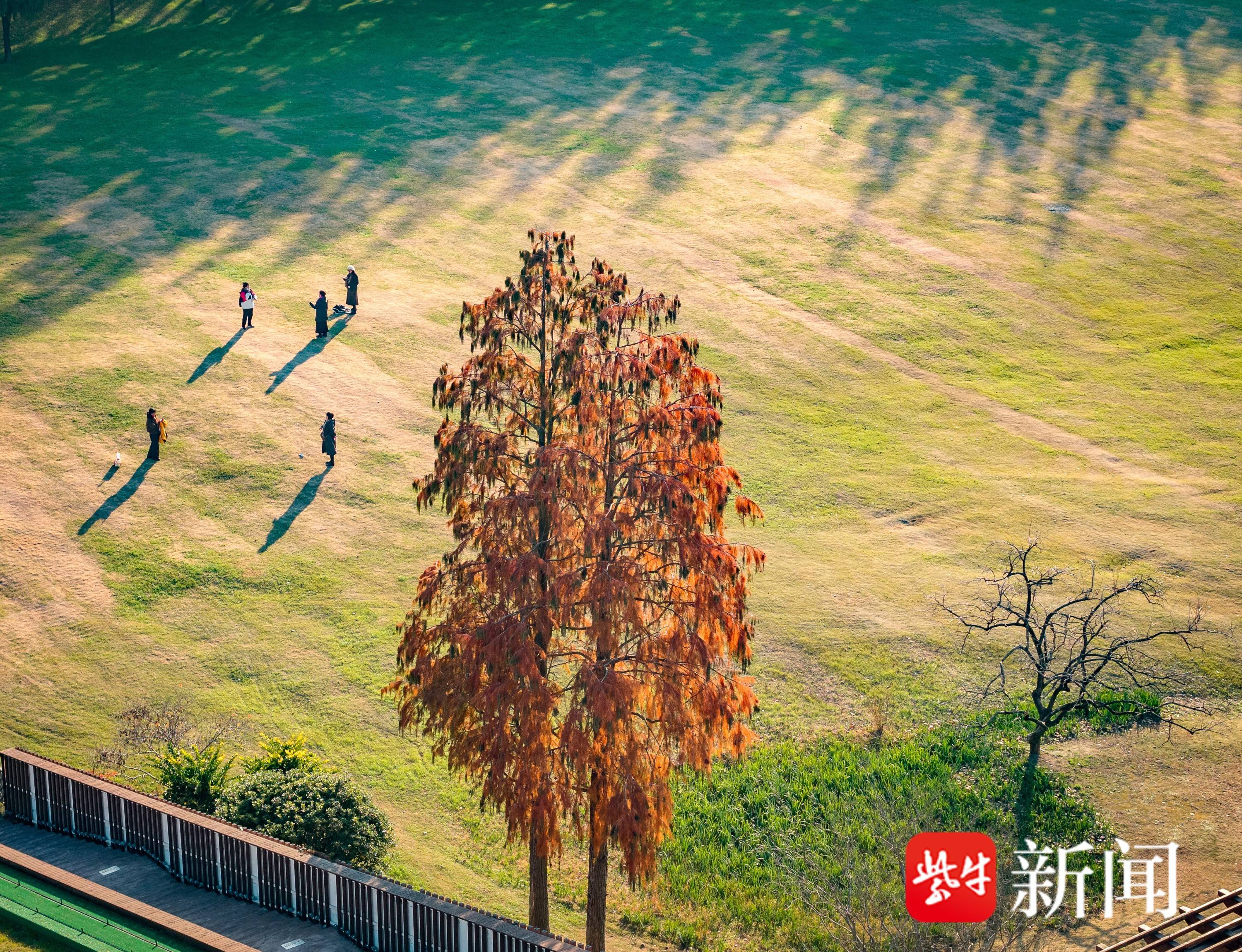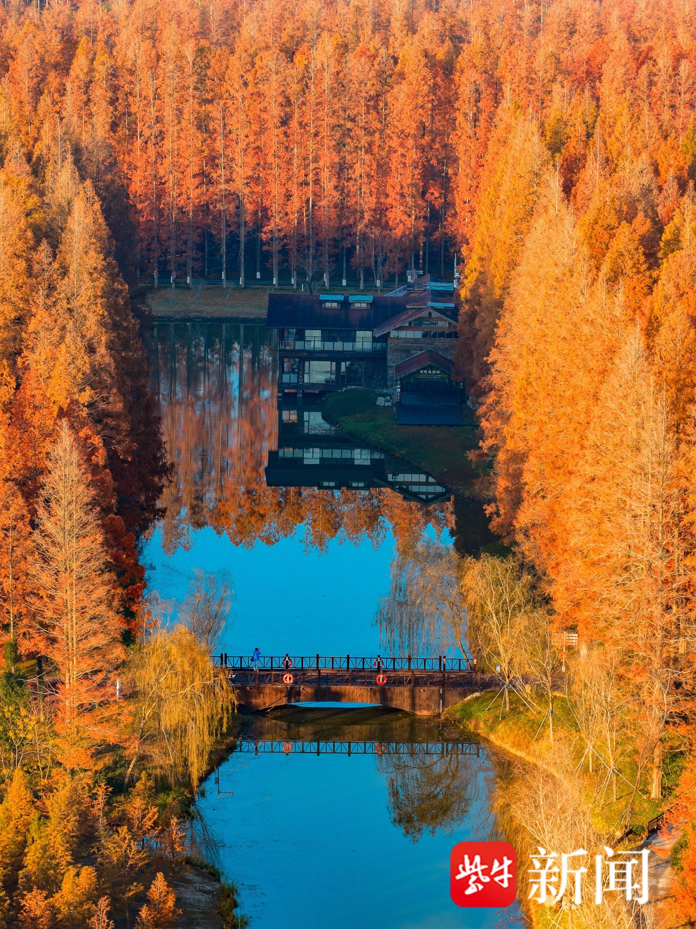 镜头掠过林梢,整齐排列的水杉林率先跃入视野。作为公园的“颜值担当”,这些生长近半个世纪的“活化石”褪去夏日的浓绿,渐次转为橙红、绛紫,在晨雾与光影交织中,像被点燃的火炬连缀成片,与远处湛蓝的天空形成撞色美学。恰似自然打翻了颜料盒,精准拿捏住了“浓而不艳、暖而不燥”的分寸。航拍视角下,这片由人工造林缔造的“绿色奇迹”,正以最绚烂的姿态诠释着“绿水青山就是金山银山”的生态内涵,成为长三角地区初冬时节“触手可及的诗与远方”。扬子晚报/紫牛新闻记者:宋峤 摄