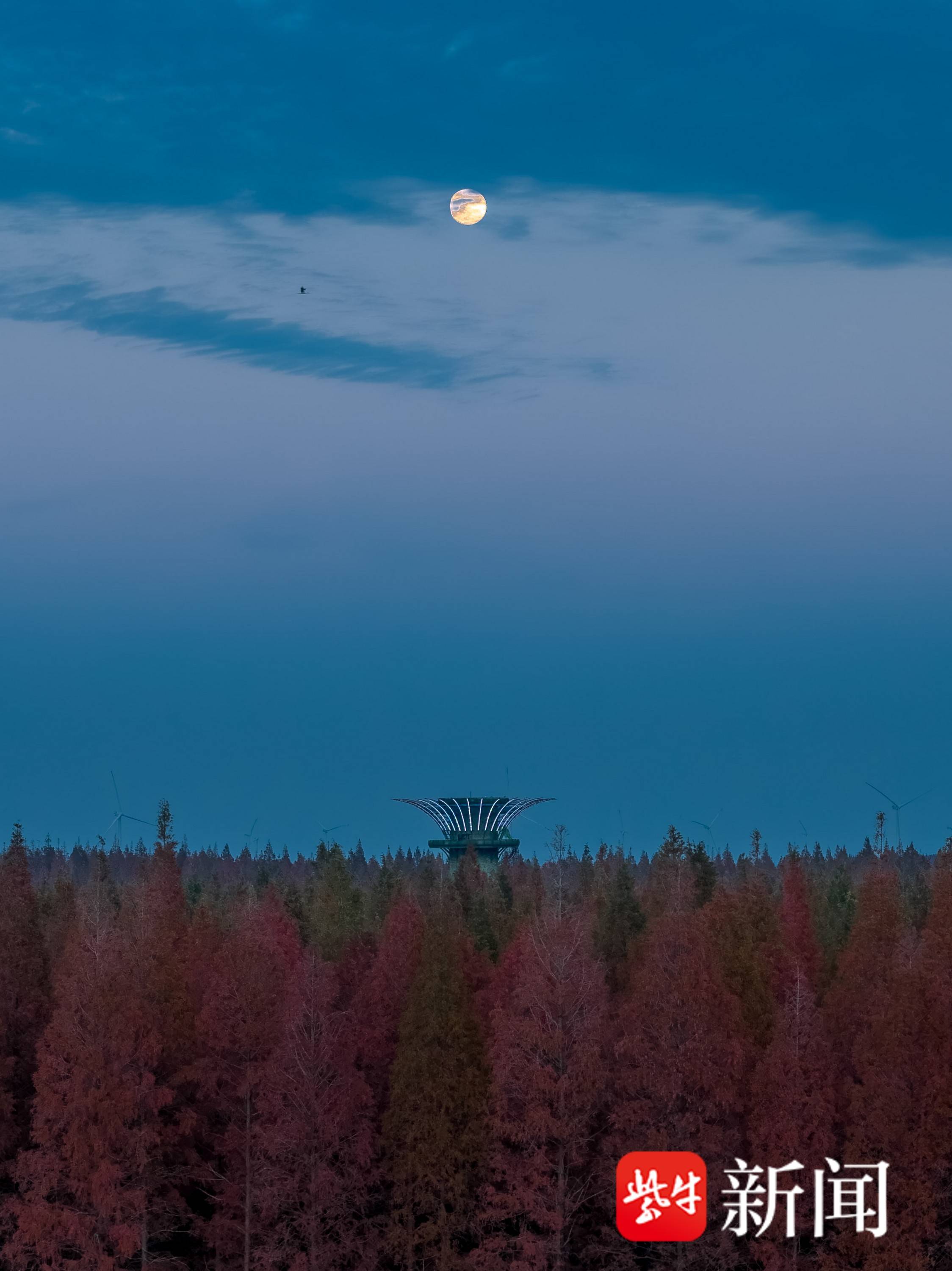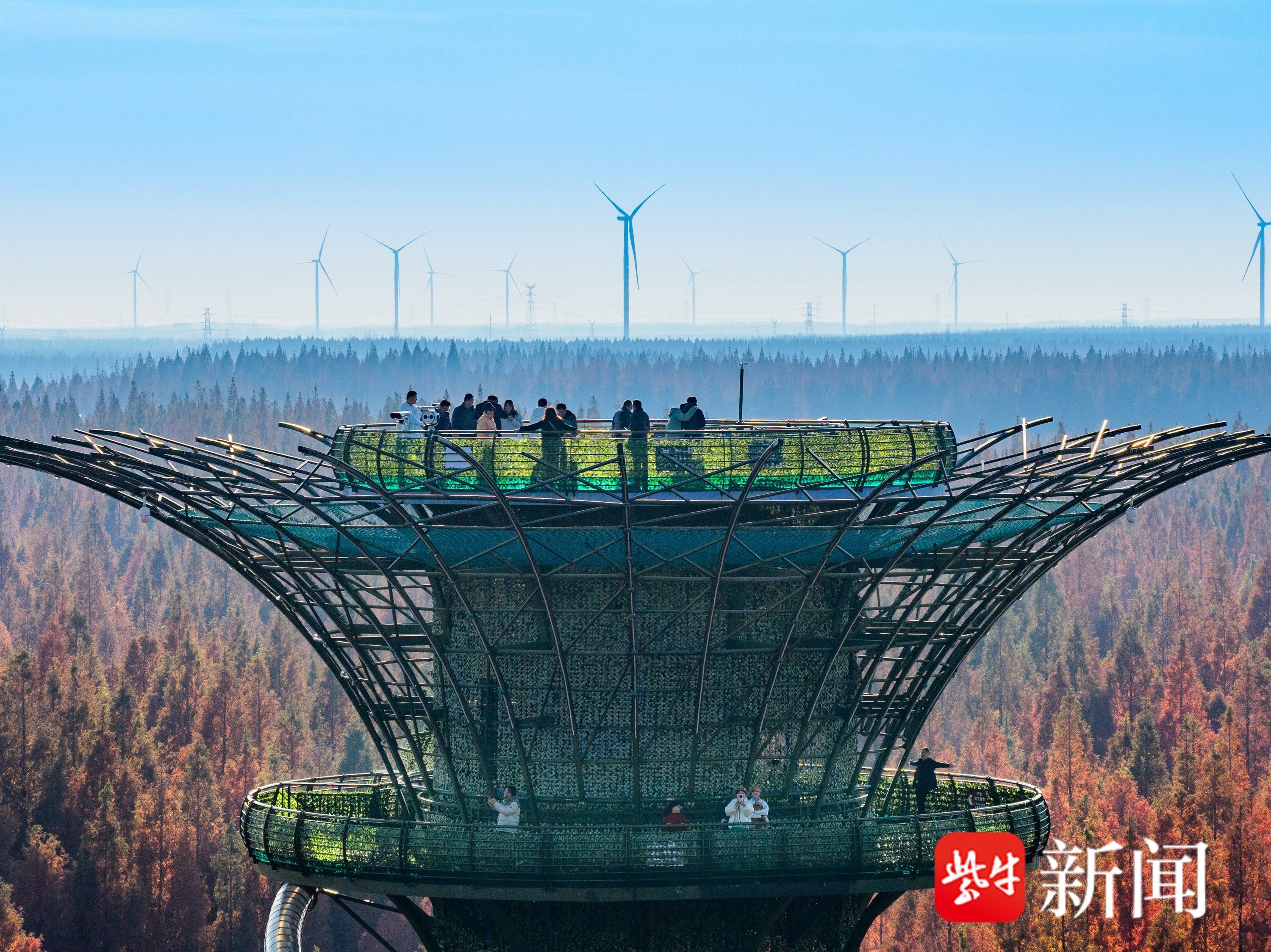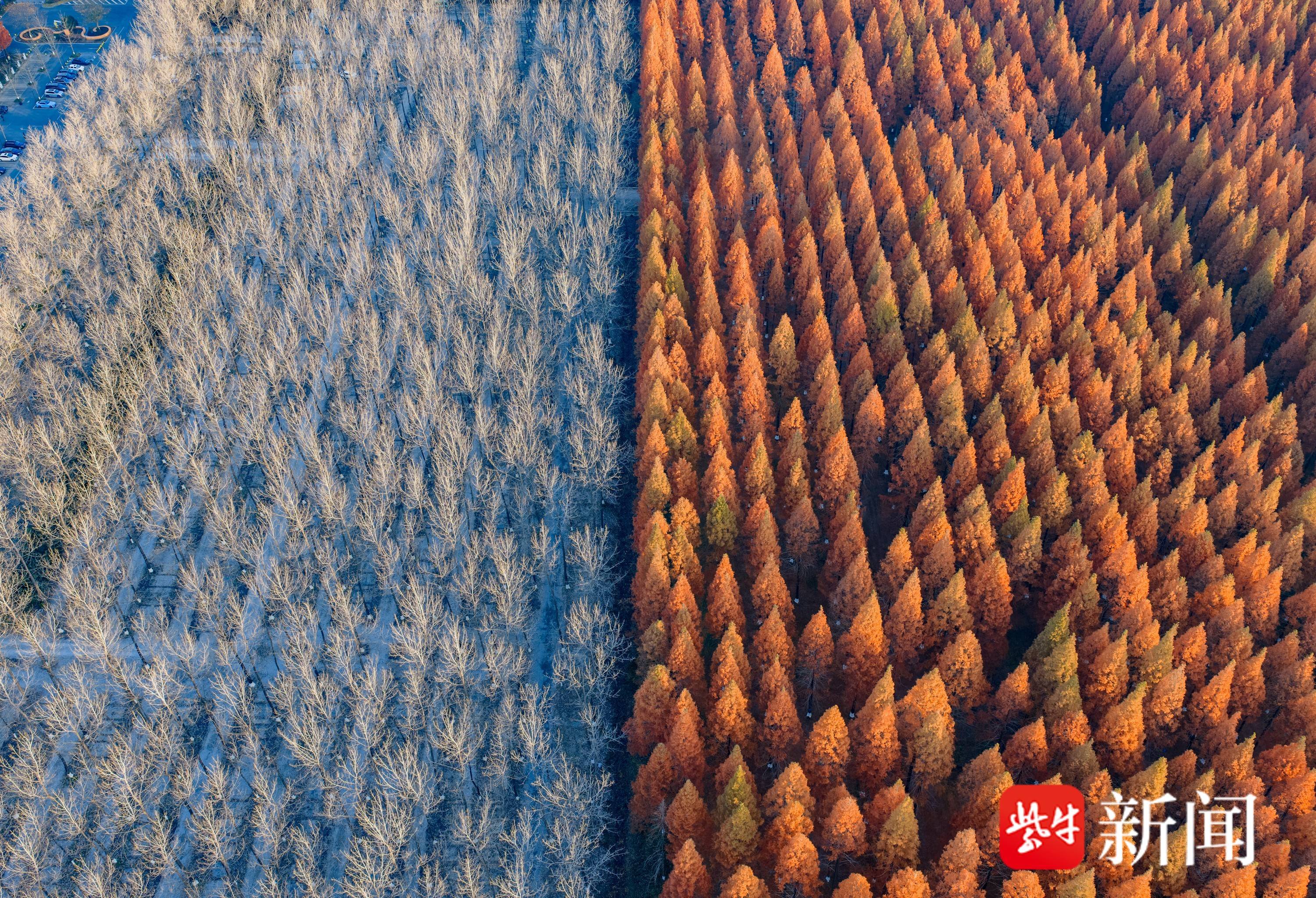 镜头掠过林梢,整齐排列的水杉林率先跃入视野。作为公园的“颜值担当”,这些生长近半个世纪的“活化石”褪去夏日的浓绿,渐次转为橙红、绛紫,在晨雾与光影交织中,像被点燃的火炬连缀成片,与远处湛蓝的天空形成撞色美学。恰似自然打翻了颜料盒,精准拿捏住了“浓而不艳、暖而不燥”的分寸。航拍视角下,这片由人工造林缔造的“绿色奇迹”,正以最绚烂的姿态诠释着“绿水青山就是金山银山”的生态内涵,成为长三角地区初冬时节“触手可及的诗与远方”。扬子晚报/紫牛新闻记者:宋峤 摄