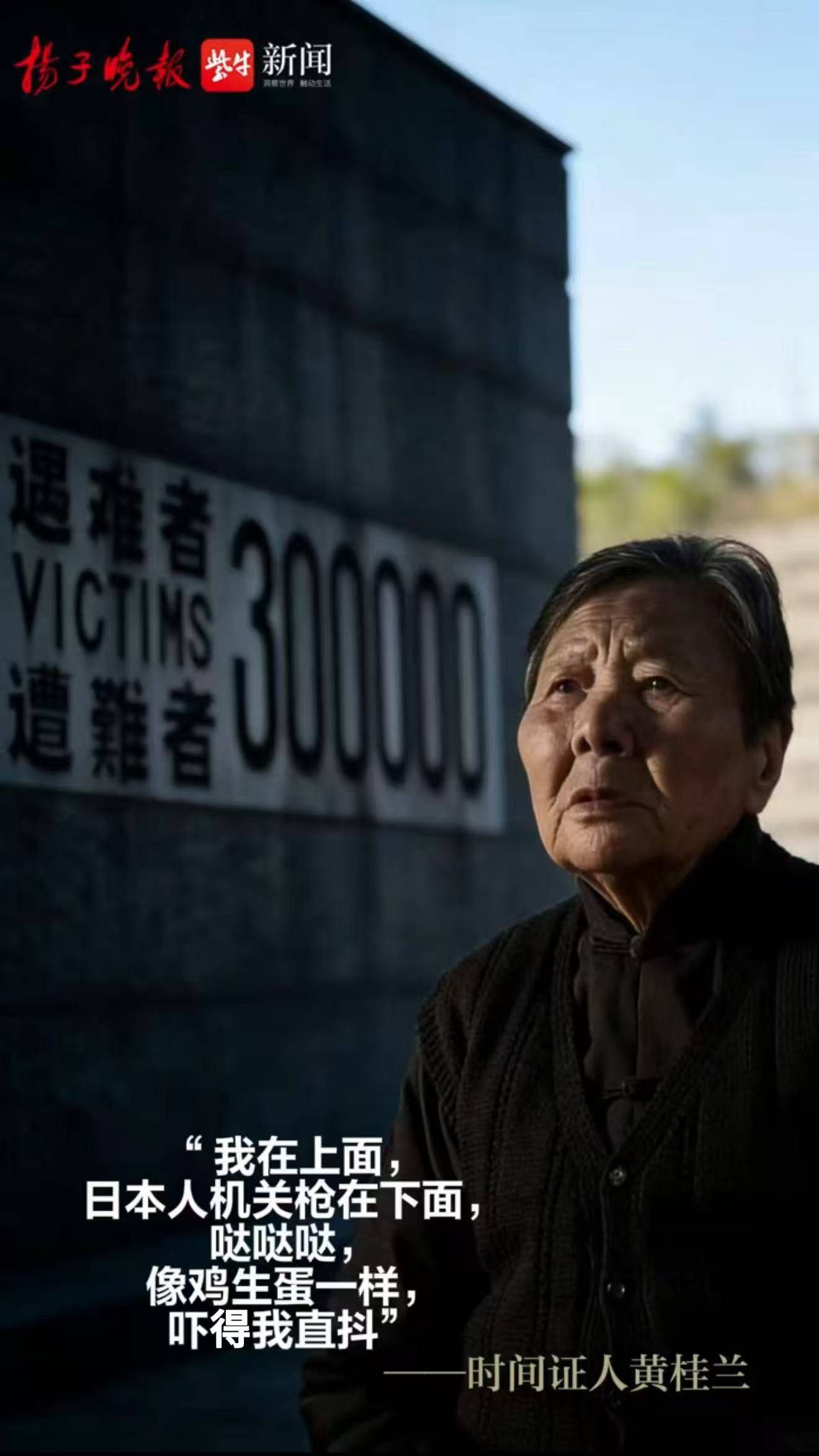 黄桂兰奶奶今年已经101周岁了,1937年侵华日军南京大屠杀发生时,她一家人住在南京,13岁的她和家人躲在阁楼逃过一劫。回忆起那一天,黄奶奶说:“日军来得很快,一下就到我家门口了。当时我睡在房子上面稻草码起来的地方,机关枪就在底下哒哒哒响,吓得我直抖。我姑奶奶没来得及躲,被打死了。日本兵没望见我,他们要是跑到上面来,我肯定没命了。”