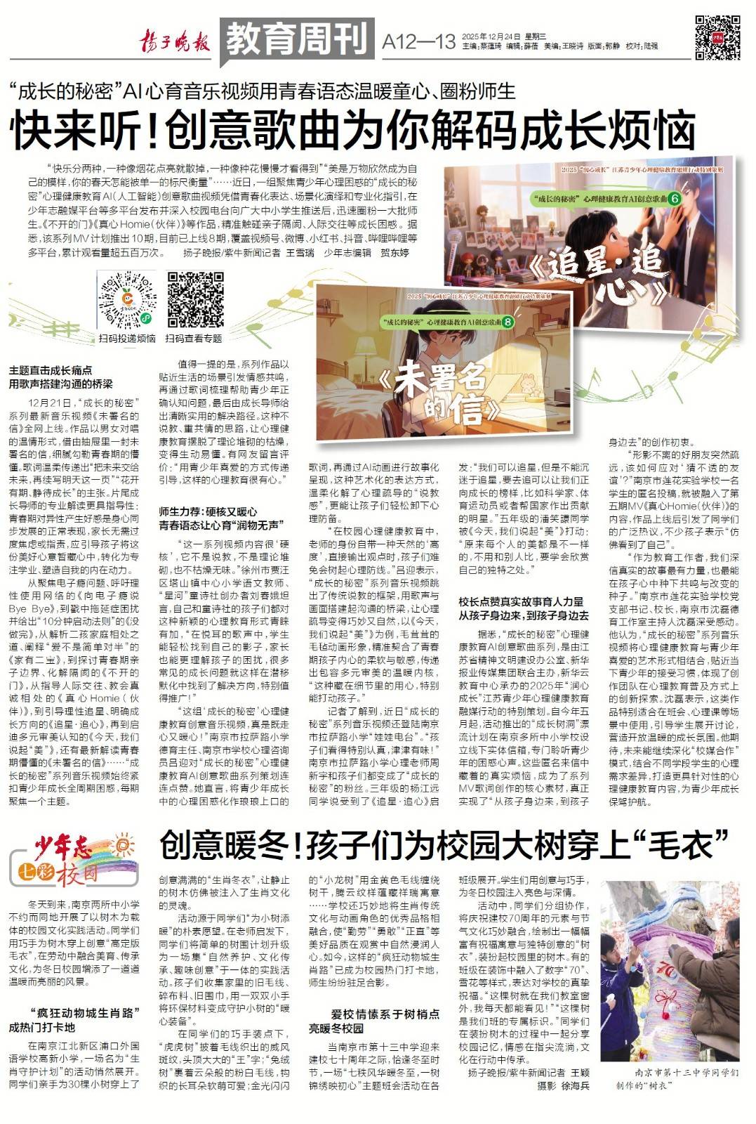 据悉,“成长的秘密”心理健康教育AI创意歌曲系列,是由江苏省精神文明建设办公室、新华报业传媒集团联合主办,新华云教育中心承办的2025年“润心成长”江苏青少年心理健康教育融媒行动的特别策划。自今年五月起,活动推出的“成长树洞”漂流计划在南京多所中小学校设立线下实体信箱,专门聆听青少年的心声困惑。这些匿名来信中藏着的真实烦恼,成为了系列MV歌词创作的核心素材,真正实现了“从孩子身边来,到孩子身边去”的创作初衷。