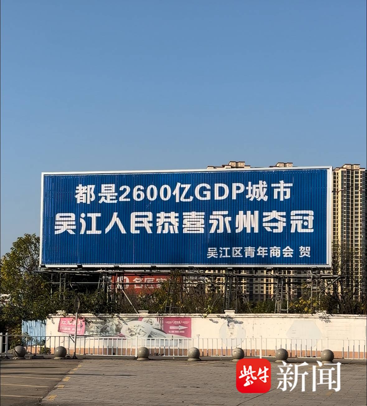 “都是2600亿GDP城市,吴江人民恭喜永州夺冠!”近日,在湖南永州潇湘大桥附近,一块醒目的巨幅广告牌悄然竖起,并迅速在网上掀起了一场关于“县域经济领头羊”与“城市精神共鸣”的热烈讨论。