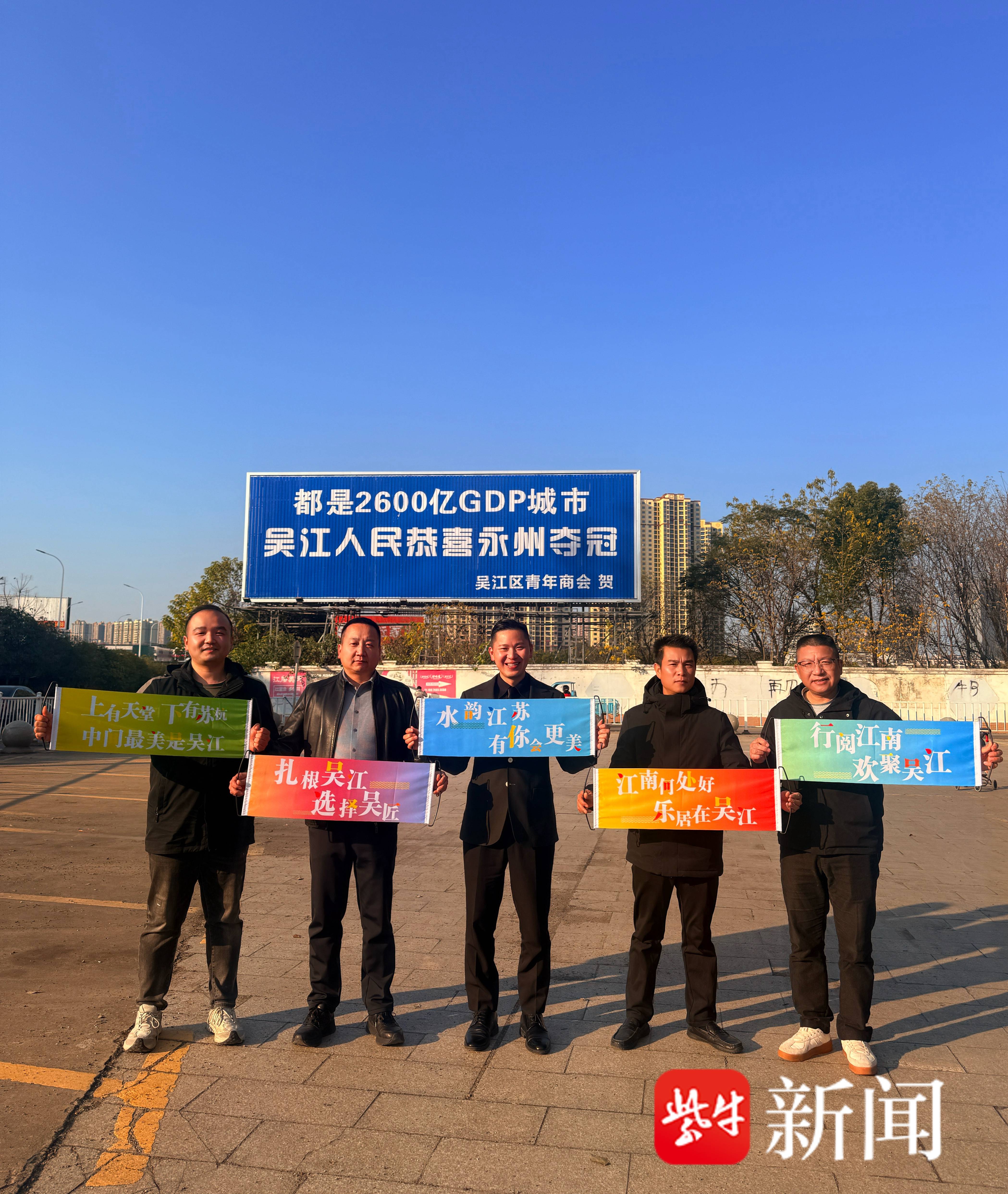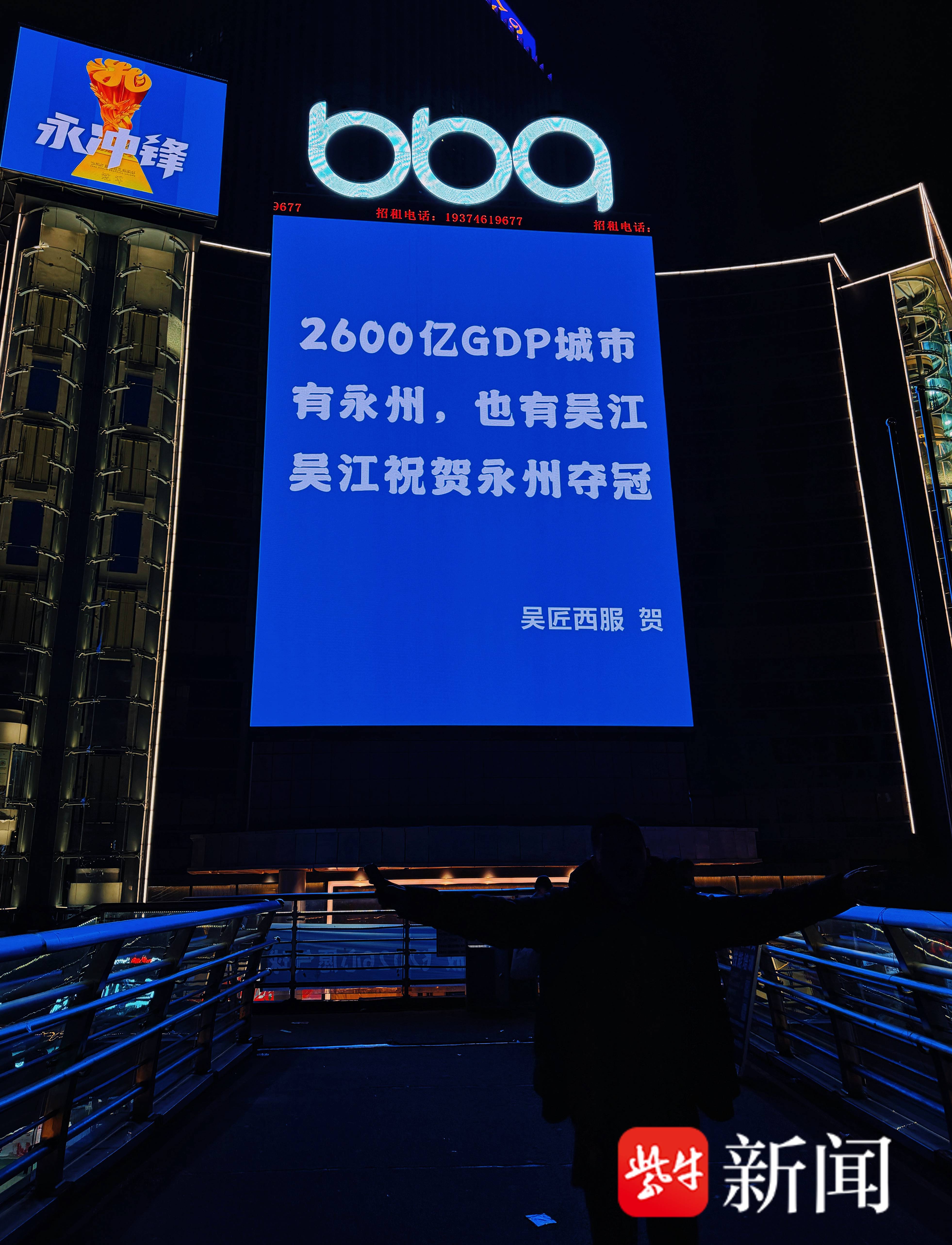 当江苏各地的祝贺牌以城市、乡镇甚至村庄的名义陆续出现在永州街头时,这块由吴江青年商会企业家陈中慧自费投放的广告牌,却因为一个精准的数字对比而显得尤为特别。1月9日,在接受扬子晚报/紫牛新闻记者采访时,陈中慧表示:“这不只是对湘超冠军的诚挚祝贺,更想说一句——你的拼搏,吴江的企业家们都懂。”