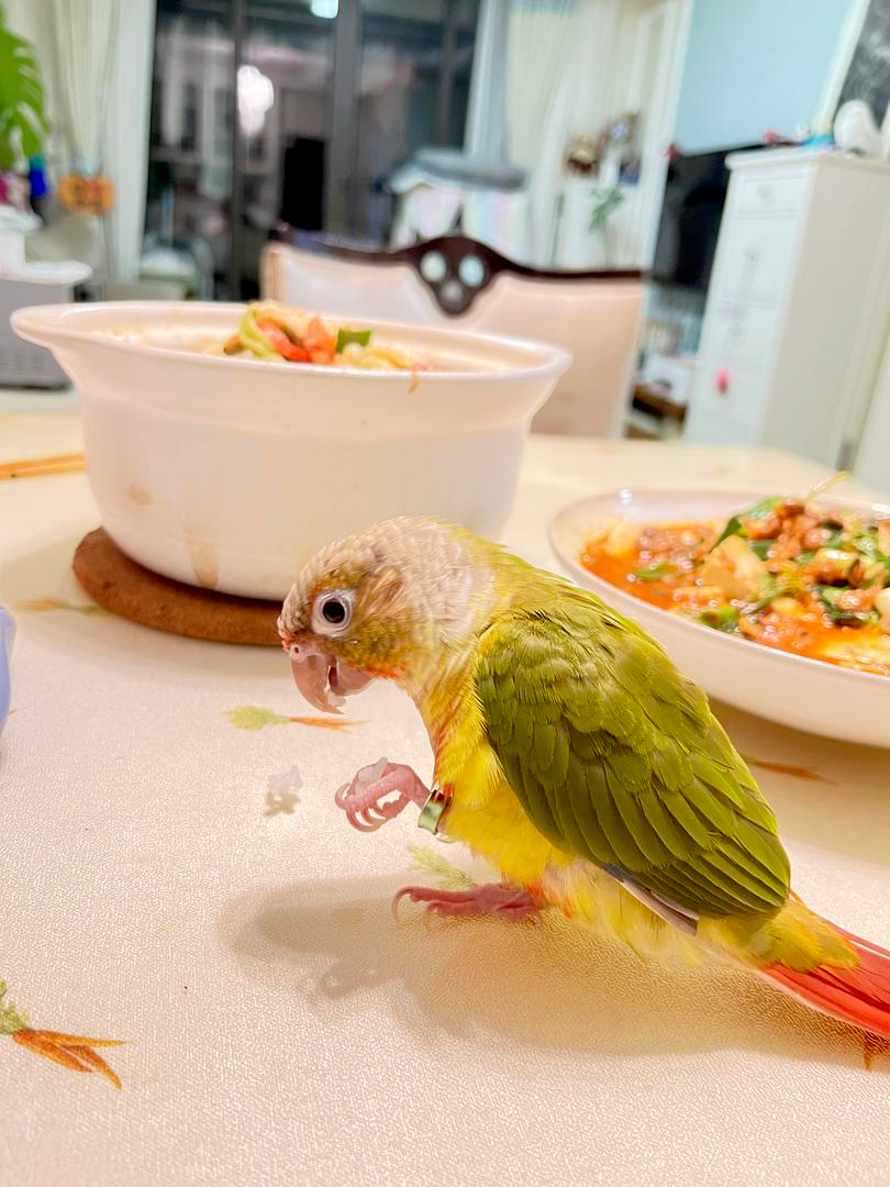 Lucky的“聪明”可不止于会说话。它还有一个让主人哭笑不得的习惯——喜欢上桌子吃米饭和面条!每当家里开饭,它就会飞上桌,凑近碗边,试图“分一杯羹”。主人说:“它觉得自己也是家里的一员,凭什么不让我吃?”