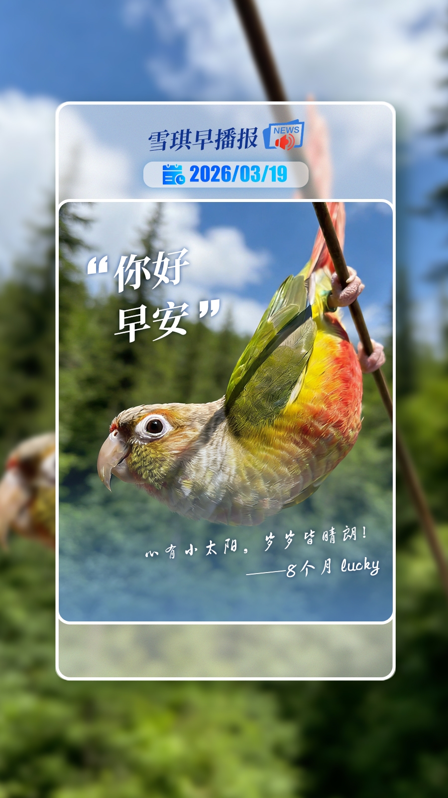 自扬子晚报“New宠星推官”征集活动启动以来,我们收到了越来越多可爱的萌宠投稿,每一只都让人忍不住反复观看。今天要介绍的这位封面明星有点特别——它不是猫猫狗狗,而是一只8个月大的小太阳鹦鹉,名叫Lucky!凭借超高智商和粘人属性,Lucky成功登上扬子晚报视频号早播报,成为又一位闪耀的New宠星推官!