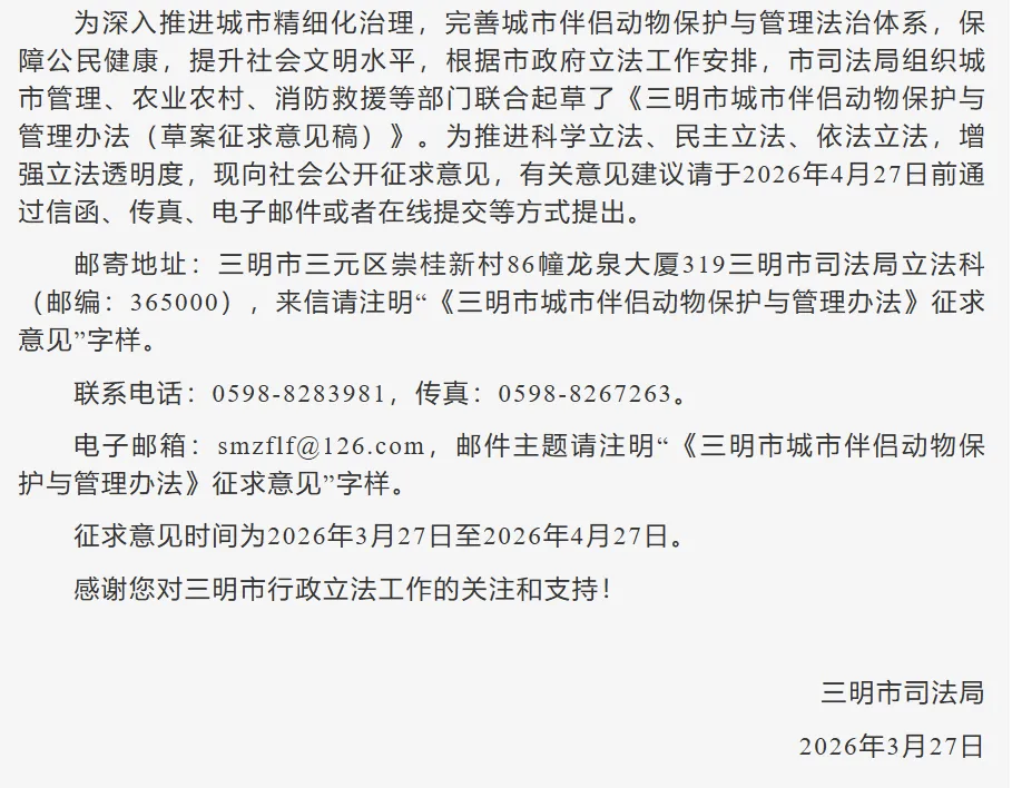 今年3月27日,三明市司法局联合城市管理、农业农村、消防救援等部门,发布《三明市城市伴侣动物保护与管理办法(草案征求意见稿)》,面向社会公开征求意见,原定截止时间为4月27日。