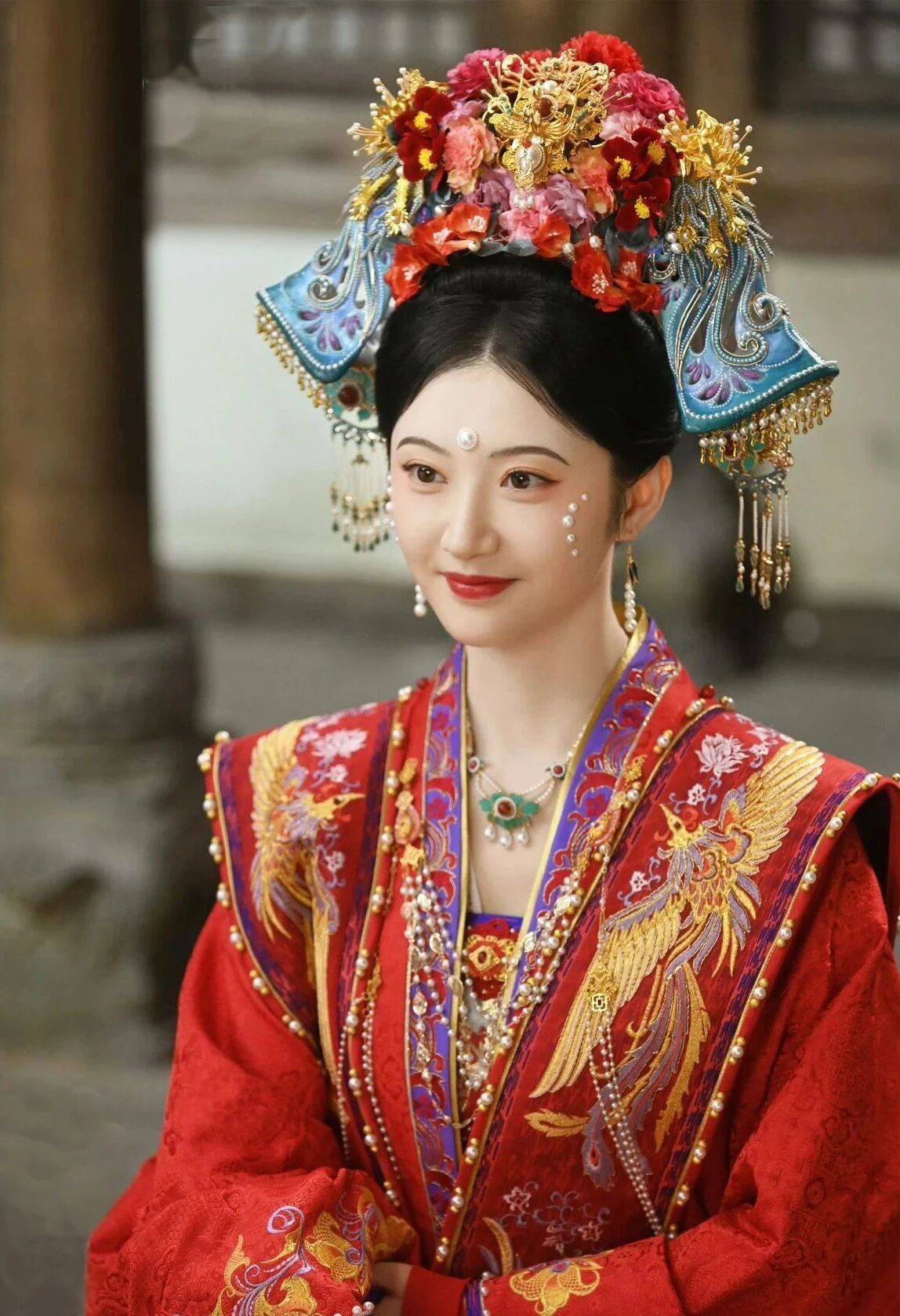 李一桐正在拍摄的是古装剧《金枝》,饰演女主陈雀儿,今年2月初开机拍摄。路透照片中出现在这个看起来有点像羊角面包的冠在历史上确实存在过,这是宋朝时特别流行的垂肩冠,也被叫做亸肩冠。山东淄博出土过一批造型十分奇特的淄博窑金三彩仕女俑,这些“仕女”并不全是宋人,随着宋金两国间不断往来与征战,宋人与女真人的服饰、生活习俗开始相互融合影响,造型夸张奇特的垂肩冠是宋人与女真人衣冠服饰相互影响的一个印证。亸肩的意思就是下垂到肩膀,垂肩冠在宋代团冠的基础上长垂四角发展而来,最初因其冠体高耸、两翼宽阔,而影响到日常生活,宋廷为此曾下达“高毋得过七寸,广毋得逾一尺”的禁令。两宋时期垂肩冠风靡一时,《大宋宣和遗事》中描述艺妓李师师的装扮便是“亸肩鸾髻垂云碧,眼入明眸秋水溢”。