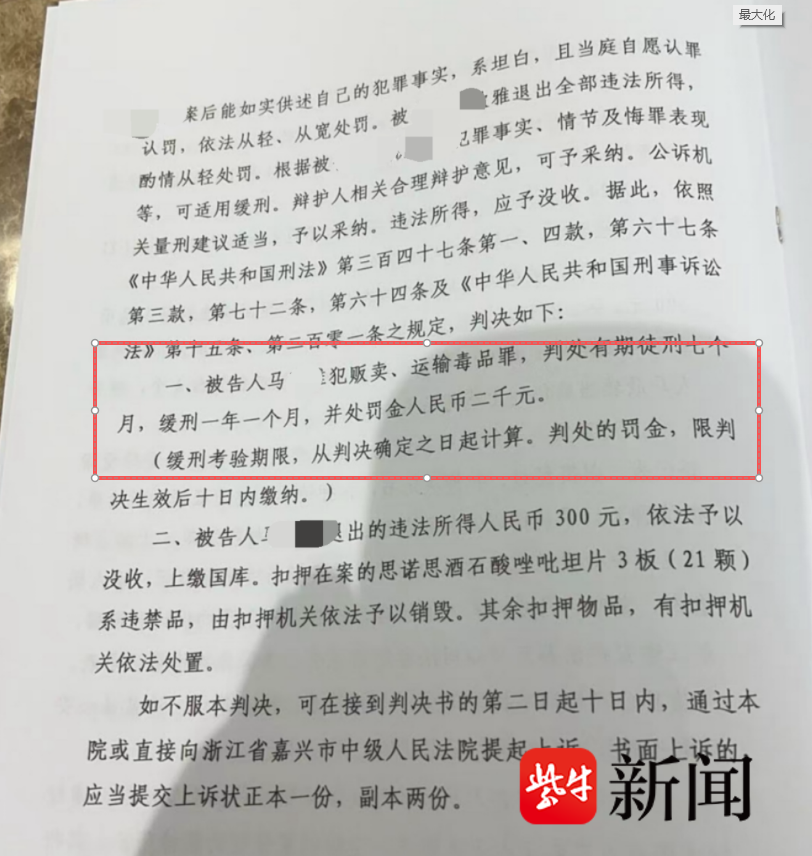 记者梳理发现,2024年10月,海盐县人民检察院指控马小姐犯贩卖、运输毒品罪,向法院提起公诉。2024年12月,该案在海盐县人民法院一审开庭,法院审理后认定马小姐违反国家精神病药品管制法规,通过快递邮寄方式向2人2次贩卖、运输国家管制的精神药品,其行为已构成贩卖、运输毒品罪。因其适用缓刑,最终马小姐被判处有期徒刑七个月,缓刑一年一个月。