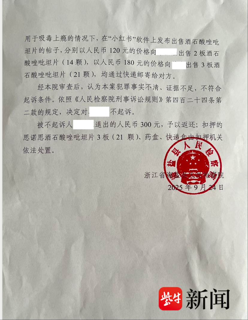 暂居上海的马小姐是一名“00后”,2024年1月,她被确诊患上系统性红斑狼疮、狼疮性脑病,治疗期间医生给她开了8盒思诺思(酒石酸唑吡坦片)。在病情好转后,本着不浪费的想法,她将剩余的5盒挂到网上出售,分别被广东和浙江的两名买家买走。孰料,当年7月她被浙江省嘉兴市海盐县警方拘捕。海盐县人民检察院指控马小姐犯贩卖、运输毒品罪,海盐县人民法院判处其有期徒刑七个月,缓刑一年一个月。马小姐不服判决上诉。浙江嘉兴中院作出《刑事裁定书》,撤销一审判决,将此案发回重审。2025年9月24日,检察院对马小姐作出《不起诉决定书》。