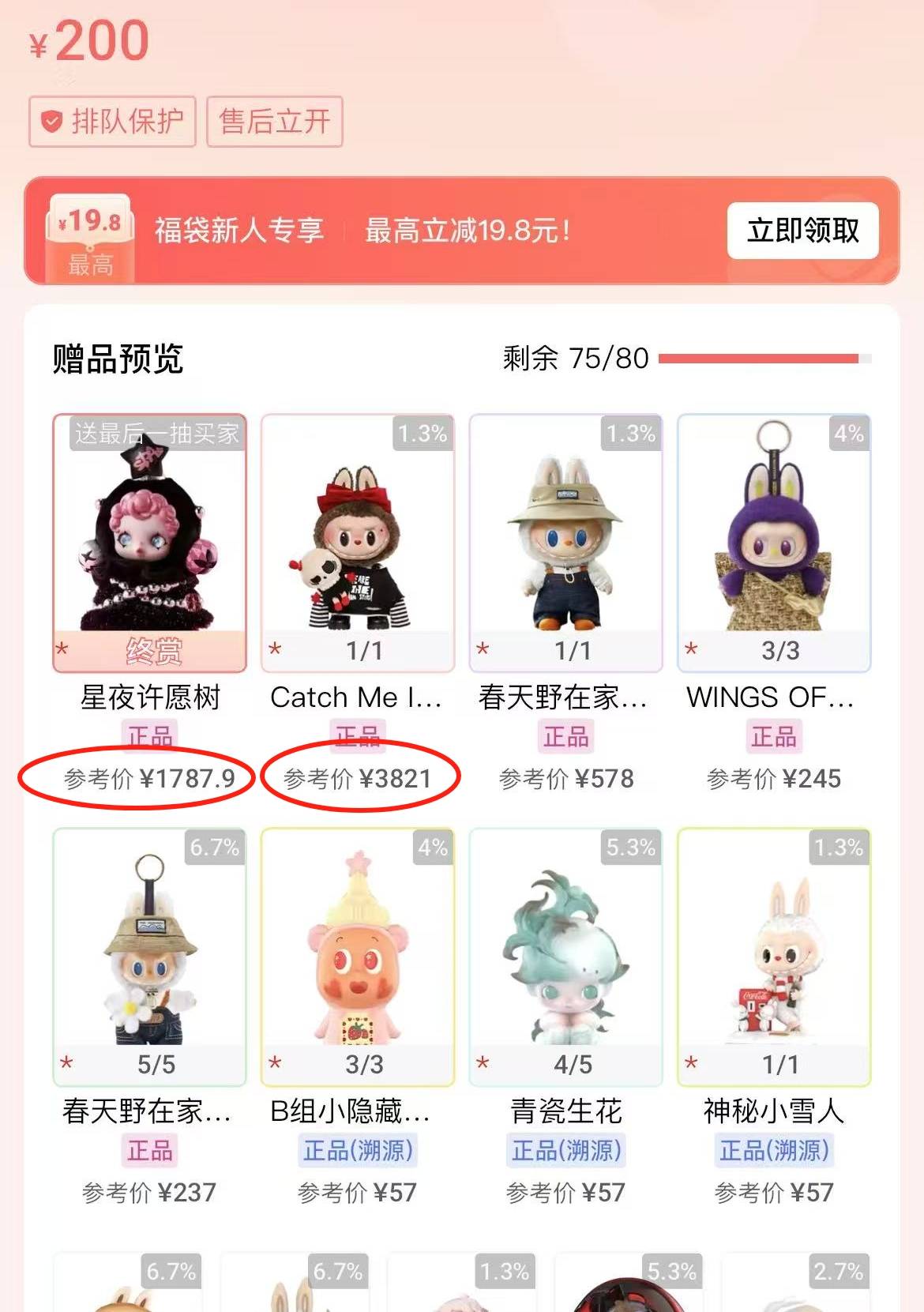 蓝女士介绍,每车福袋最多设100个实物奖品,买家能提前看奖池物品及市场价,完成支付后才可以看到自己抽中了什么。福袋的售价由卖家设置,大多在30元至200元之间,同一车福袋可以包含多种系列的产品,也就是说,几十元的福袋对应的可能是20元的常见款,也可能是上千元的隐藏款。