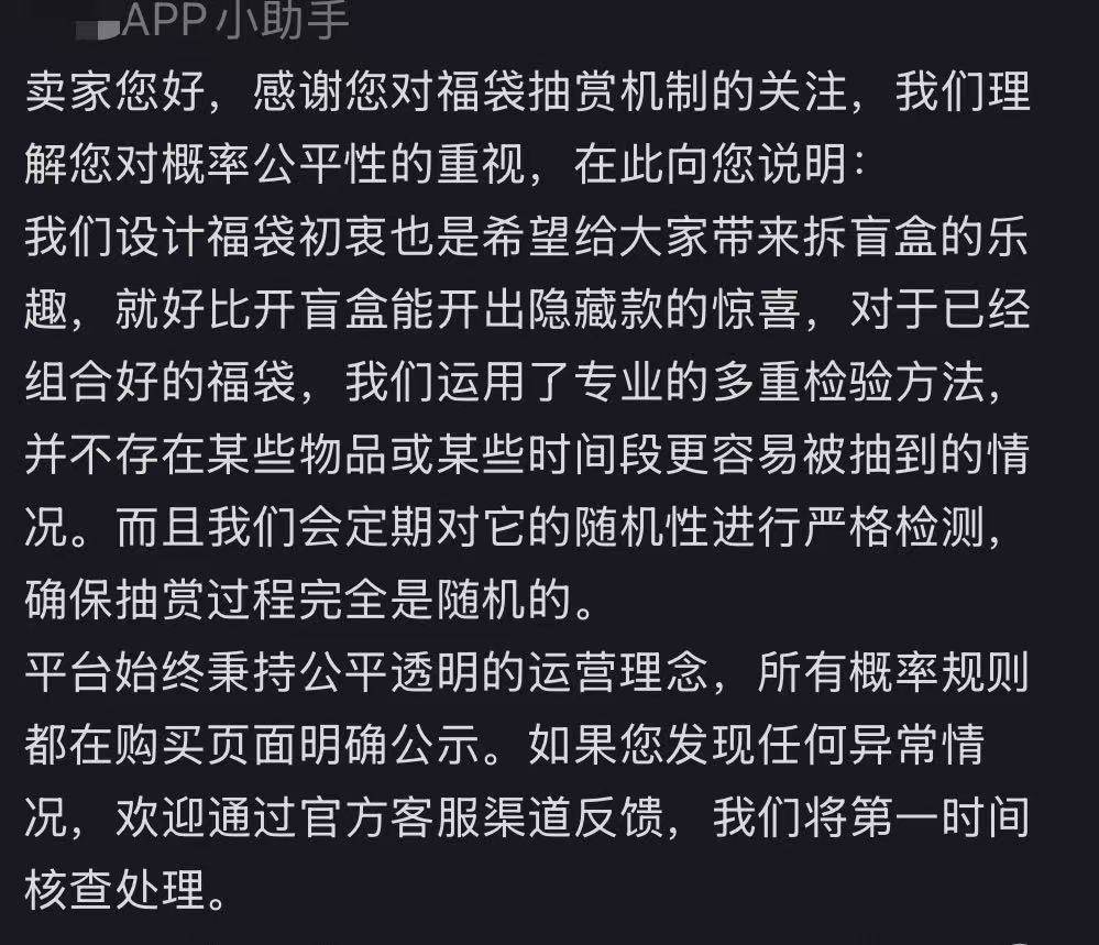 这则内容也引起了该潮玩平台“小助手”账号的注意,平台针对于女士反映的问题作出回应,但否认了概率不平衡导致“车主”频繁被“爆头”的情况:“我们设计福袋初衷也是希望给大家带来拆盲盒的乐趣,就好比开盲盒能开出隐藏款的惊喜,对于已经组合好的福袋,我们运用了专业的多重检验方法,并不存在某些物品或某些时间段更容易被抽到的情况。而且我们会定期对它的随机性进行严格检测,确保抽赏过程完全是随机的。平台始终秉持公平透明的运营理念,所有概率规则都在购买页面明确公示。”