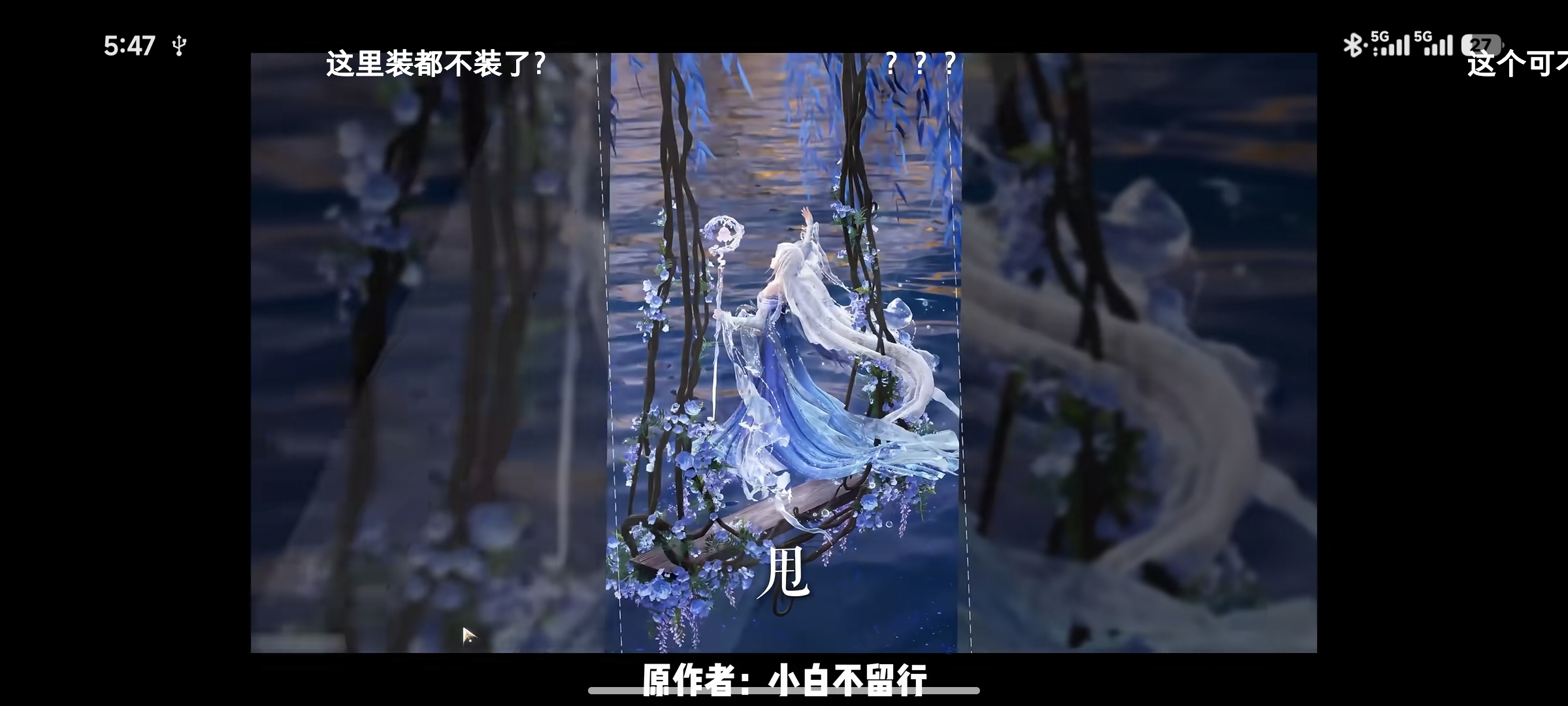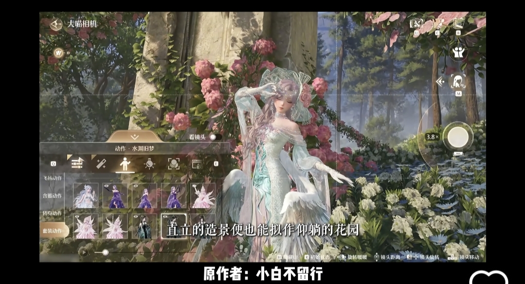 在游戏中,很难让人物像真人那样自由躺下来,因为游戏里的动作限制非常大,大都是站立动作,小白想拍躺下来的动作,只能设定有一个铺满繁花的画面,通过直立造景,制造出人物仰躺的画面。“‘一晨叔叔’用了几乎一模一样的画面,在一个相框上别了几朵花,说是花园,拟作人物仰躺。但他是在现实世界拍摄,人物是能躺下来的,为什么还要用直立造景?因为我受游戏限制,他没有受游戏限制,但他用了一个我最不能理解的方式。”
