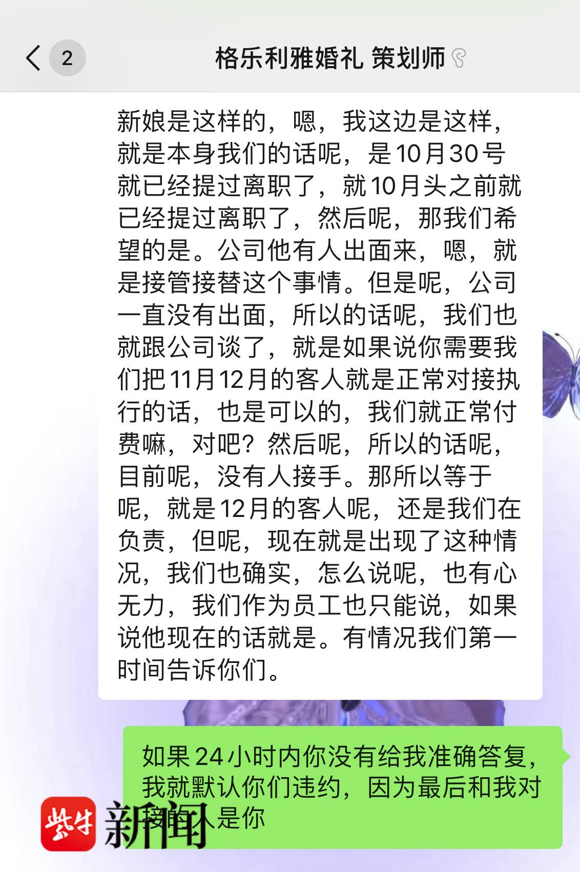 王女士说,她第一时间联系之前对接的策划,对方起初否认“倒闭”,还称“有人要制造恐慌”,之后告诉王女士“10月底已提交离职申请,处理不了此事”,此后便不再回复微信。
