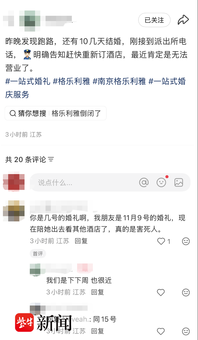 记者在社交平台搜索发现,受格乐利雅雨花台店闭店影响的新人并非个别。一位网友表示,距离婚礼仅剩10几天,已接到派出所电话“建议尽快重新订酒店”,另有多名网友表示,他们原定于11月中旬的婚礼,目前也在紧急寻找代替的场地。