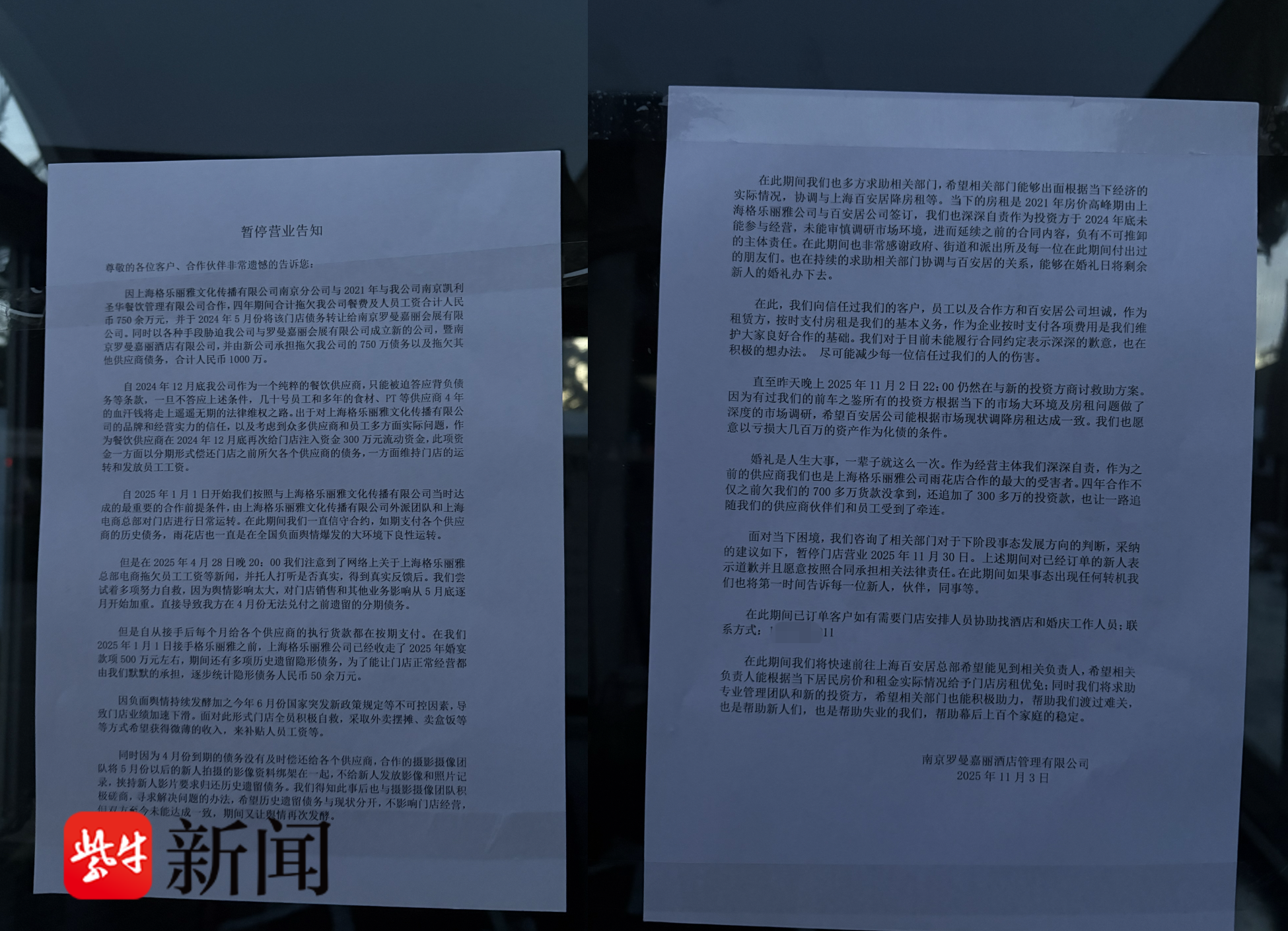 近日,南京市民王女士(化名)在网络平台发帖称,距离她举办婚礼仅一个月时间,却意外得知预定的格乐利雅婚礼中心雨花台店已陷入“闭店”危机。目前她与门店协商无果,不仅7.3万元预付款追讨无门,婚礼也需要重新寻找场地。11月3日,记者走访调查发现,社交平台上多对新人反映存在类似遭遇,而在门店现场运营方张贴的《暂停营业告知》则揭露了其背后存在“千万债务”的闭店原因。紫牛新闻记者了解到,目前雨花台区市场监督管理局已介入处理。
