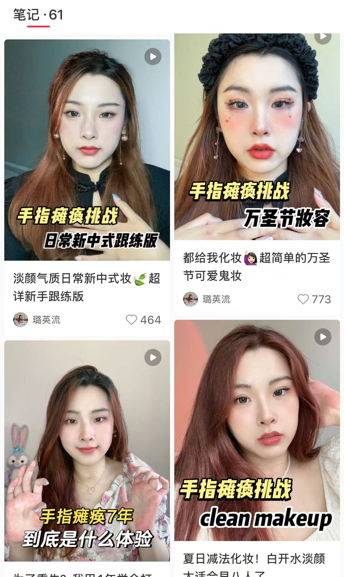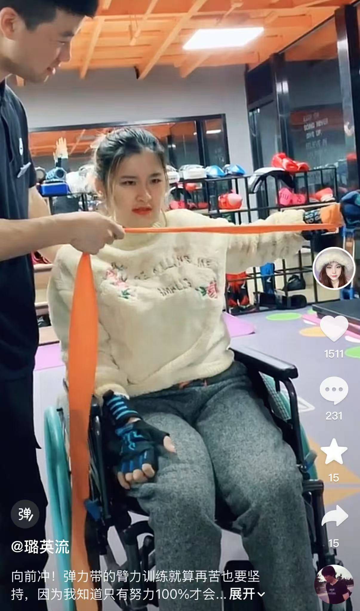 2019年1月,她以“璐英流”为网名,发布了第一条短视频——在老师帮助下用弹力带做臂力训练。此后,她陆续分享自己的康复日常、旅行经历、美妆穿搭,她的视频真实而有力量。由于手指肌肉萎缩无法抓握,她只能通过把化妆刷夹在指缝关节处,再靠手腕的力量带动,过程中常常戳到眼睛,但她从未放弃。“我们需要的不仅仅是美丽,还有自信!”这是孙晨璐在社交平台写下的心声。车祸致瘫后,她始终坚持化妆,这份看似微小的坚持,却悄悄重塑了她的状态,不仅仅是外貌上的改变,更让她在化妆过程中享受到快乐。
