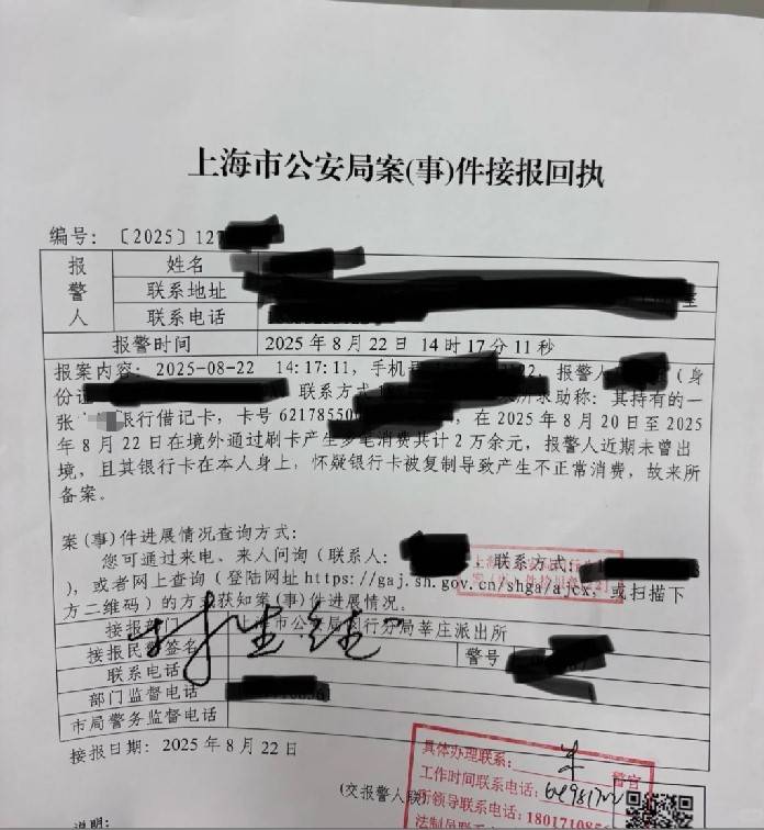 之后他向警方报案,警方表示境外调查难度极大,建议他先和银行沟通。“我就在金融消费者保护服务平台投诉,银行第二天早上给我打电话,表示同意赔付,但手续费不赔,说手续费是刷卡产生的。我说卡不是我刷的,如果没有盗刷我的卡,手续费也不可能产生,为什么不赔付手续费?经过交涉,银行在9月23日同意赔付手续费。”