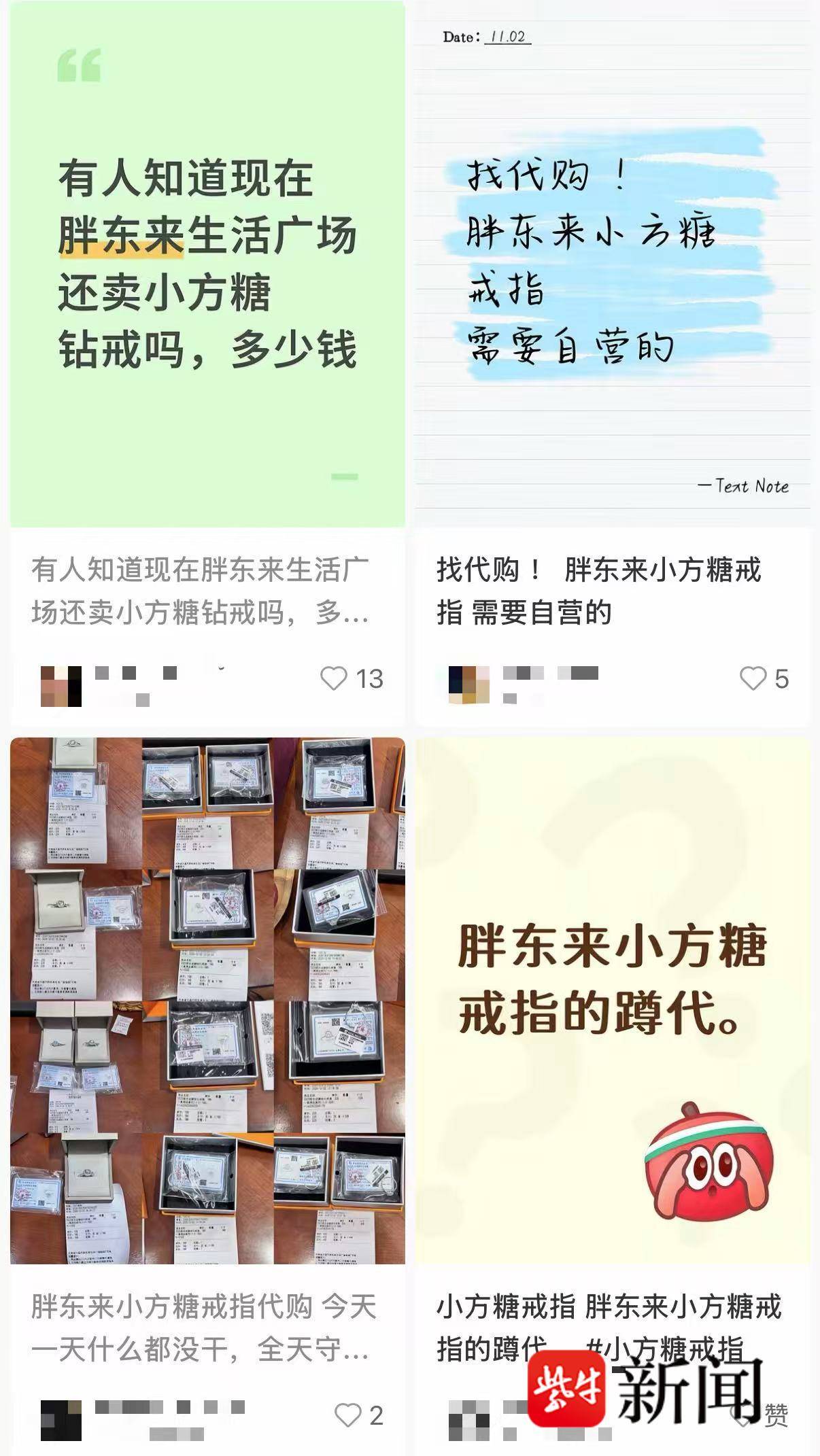 记者在搜索时注意到,随着胖东来“小方糖戒指”热度的持续攀升,二手交易平台与社交平台上也出现了大量代购商家,不少消费者主动提出加价寻求代购。记者在闲鱼、小红书等平台搜索发现,“胖东来小方糖戒指”的代购普遍在原价基础上加价20元左右,部分代购商家表示“支持附赠小票证书”“支持专柜验货”。其中一家代购店铺信息显示,其代购服务费约为36元,一款原价179元的戒指,最终售价涨至215元,相关商品总销量已超100件,周销量较此前上涨10多倍,目前已有超600人加购。