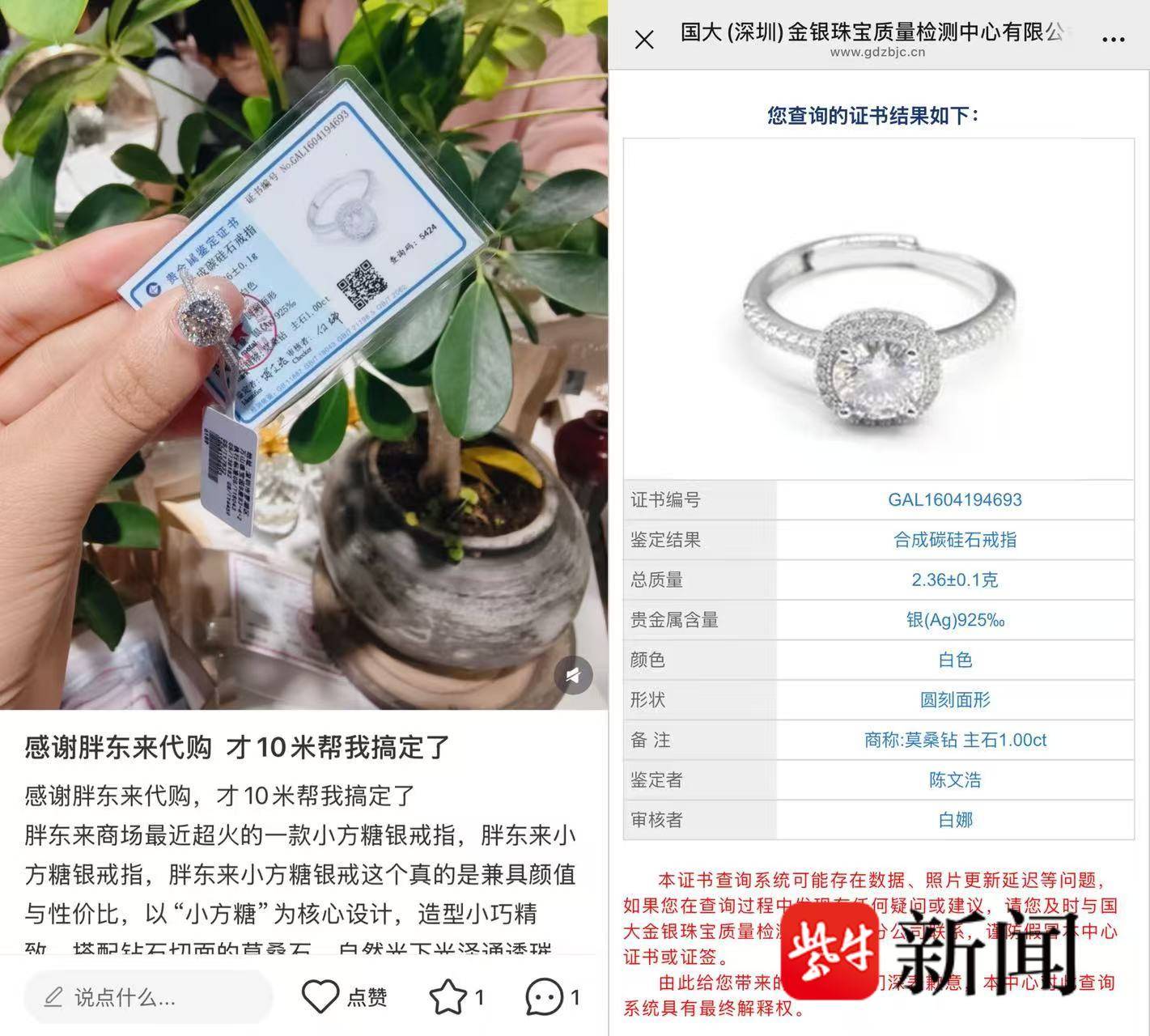记者在社交媒体平台注意到,已有不少消费者分享了此前的购买体验并晒出了实物图:“这么大的‘钻’,这么闪,情绪价值直接拉满了!”“终于找代购帮我买到了,性价比超高,实物比图片还要惊艳!”记者通过网友发布的一张《贵金属鉴定证书》查询看到,其购买的189元款的戒指总质量约2.36克,其中贵金属含量为银(Ag)92.5%,主石“莫桑石”为1.00ct,鉴定结果系“合成碳硅石戒指”。据了解,“ct”是宝石重量单位“克拉”的缩写,“主石1.00ct”即表示戒指最主要的宝石重量为1克拉,即0.2克。