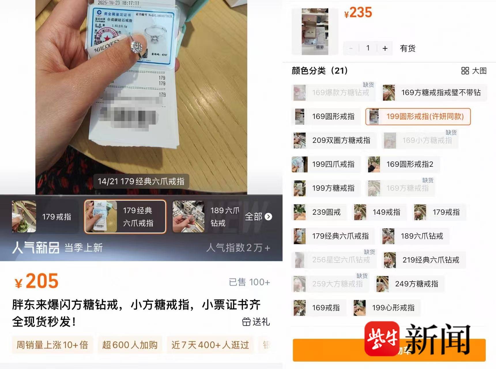 “一百多块钱就能拿下大‘钻’戒,还要什么自行车?”近日,胖东来一款“小方糖戒指”突然在社交平台上走红,相关内容刷屏不断。这款被网友称为“1克拉钻戒平替”的饰品,以169元起的亲民售价,凭借亮眼造型与超高性价比迅速“出圈”,电商、社交平台更是出现了不少代购商家,相关话题登上热搜。12月3日下午,扬子晚报/紫牛新闻记者向胖东来门店工作人员了解到,该款戒指是胖东来联营专柜引进的产品,材质由925银与合成碳硅石构成,目前多个门店都已经断货。记者调查发现,近年来快消类珠宝等平价饰品愈发受到年轻人青睐,与传统购买模式不同,电商等网络渠道已成为消费者了解、购买这类饰品的主要途径。