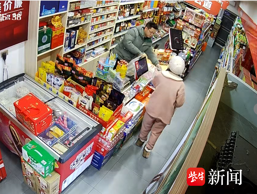 图为2025年12月15日超市老板陈辉塞给女顾客现金