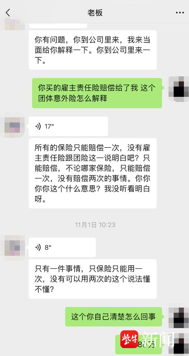 小张告诉记者,得知团体意外险保单后,10月31日,他曾向保险公司业务员询问关于团体意外险的事,业务员表示不清楚,随后便拉黑了小张。11月1日,小张又向老板咨询关于团体意外险的事,老板表示,所有的保险只能赔付一次,并要求小张把之前收到的6万元钱退还给他,让小张自己去找保险公司理赔。