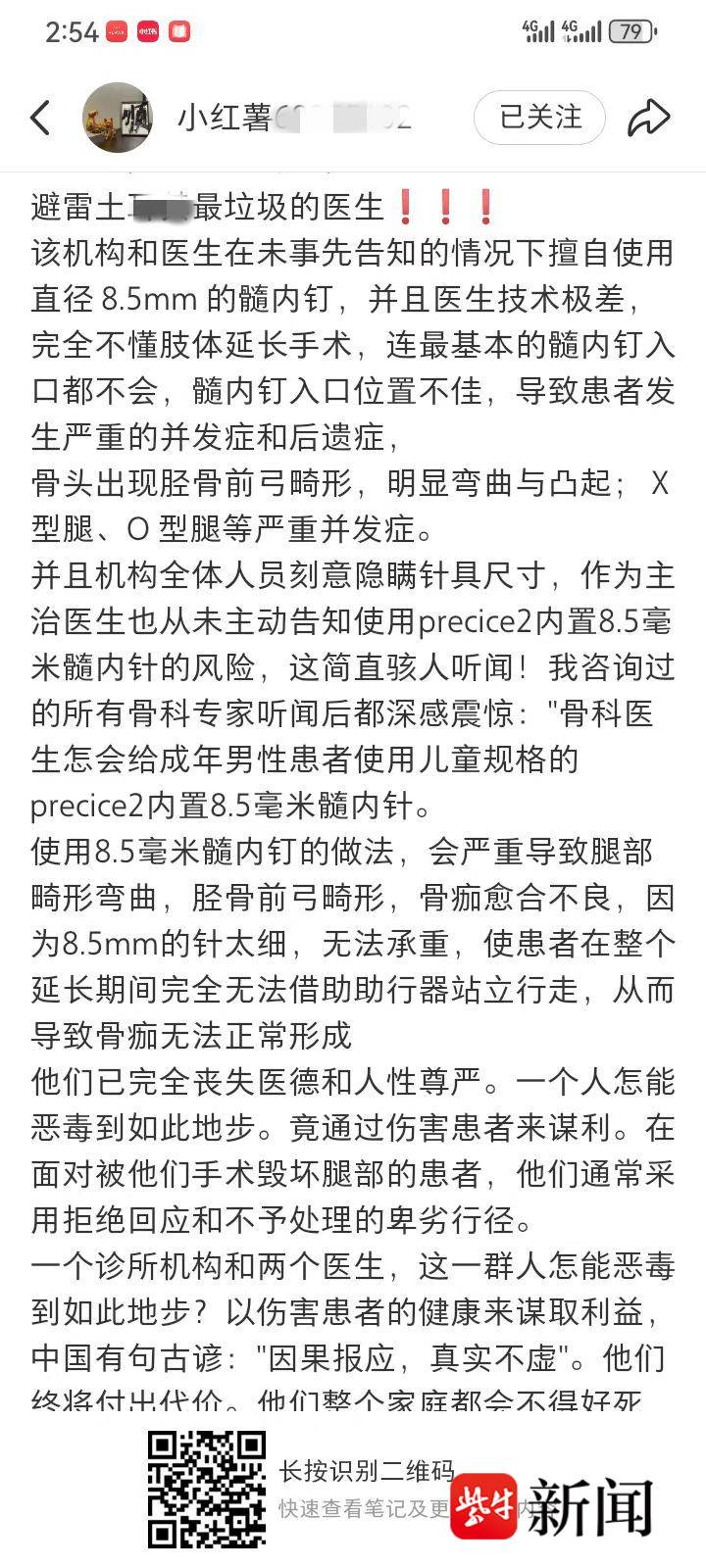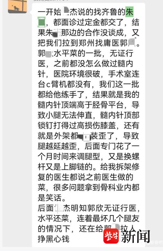 在一个名为“断骨吧”的贴吧中,记者看到,一位名为“夜阑更深”的网友投诉称,他通过中介找到朱姓医生,因合作没谈成,他从齐鲁某地被拉到郑州找到医生郭某。但郭某“水平菜,无证行医,之前没怎么做过髓内针”,加之医院手术环境差,“结果他的髓内针顶端高于胫骨平台,导致小腿无法伸直,髓内针顶部锁钉打得过高,损伤膝盖,下架都装歪了。”这名网友称,手术致腿越来越歪,后面花了一个月时间来调腿型,又是换螺杆又是上脚链的。