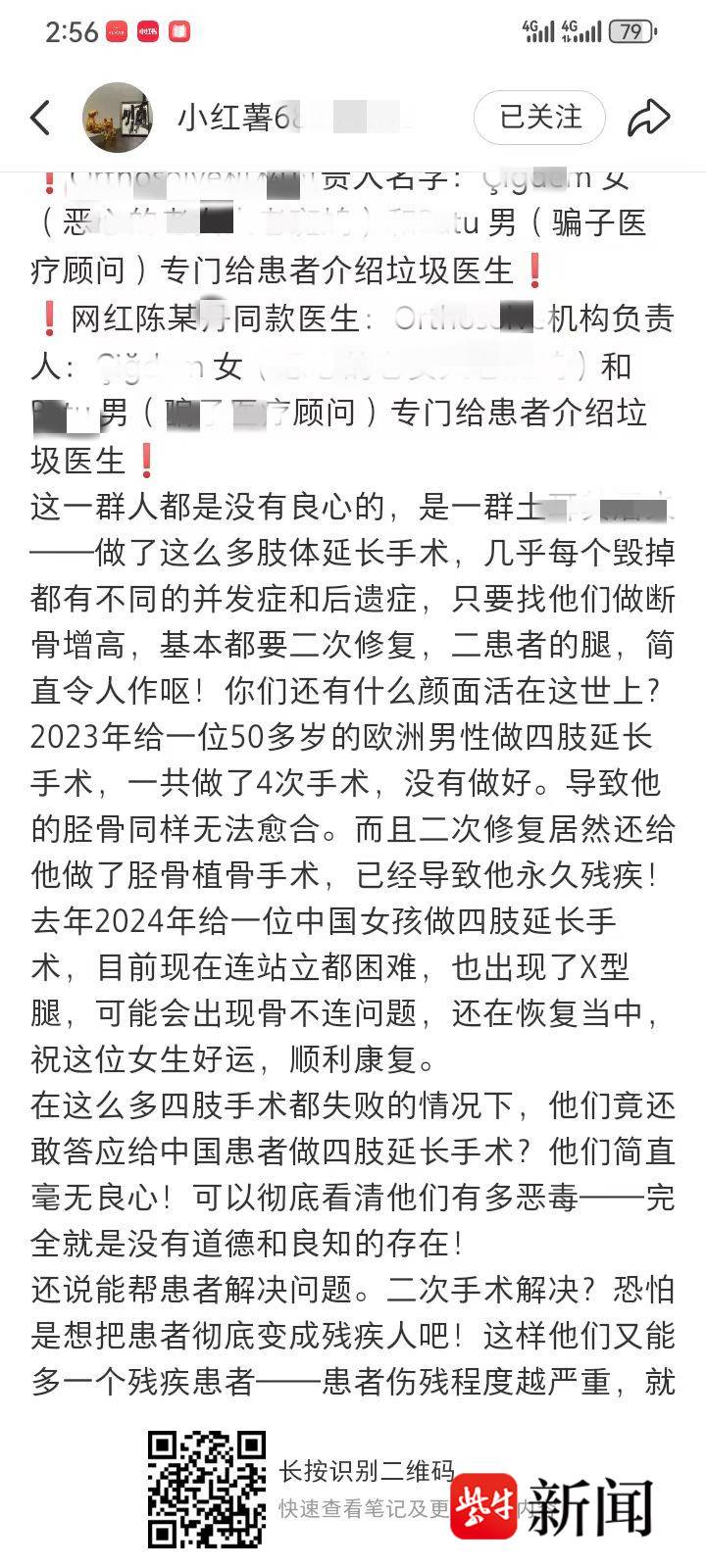 今年4月9日,扬子晚报/紫牛新闻曾以《女子花60万去国外“断骨增高”13cm,后遗症缠身维权艰难》为题,报道了江苏女孩小梦(化名)在2021年通过他人介绍,花费60万元前往土耳其接受了断骨增高手术,伴随而来的后遗症让她痛苦不已,双腿持续疼痛,不仅无法奔跑和下蹲,还患上了慢性骨髓炎。此外,与小梦同期接受手术的“腿友”(做过断骨增高术的以腿友互称)中,不少人出现了不同程度的后遗症,而医托们换了“马甲”继续揽客。