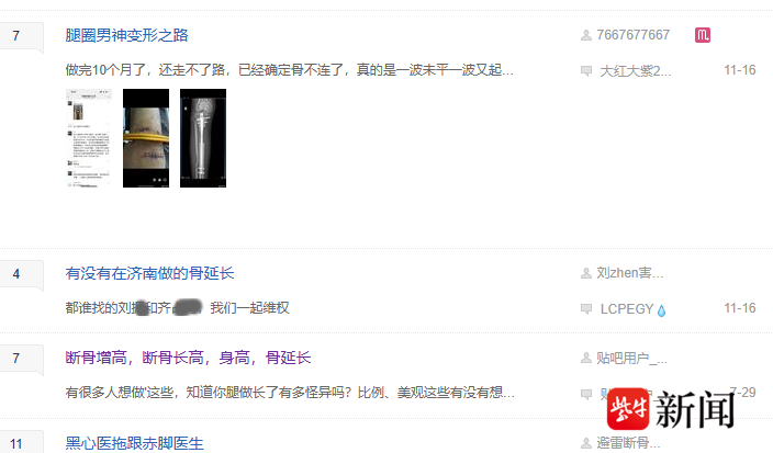 扬子晚报/紫牛新闻记者在网上多个平台注册进入后,经过前期摸排甄别,并参与讨论后发现,多名“腿友”反映称,在中介的招揽介绍下,一些梦想增高的“断骨增高”手术在国内悄悄施行,因不被允许,致使医疗水平及卫生环境得不到保障,甚至施行手术的医生连资格证都没有。