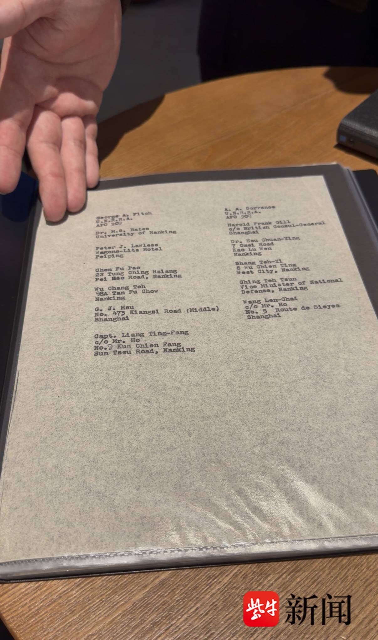在南京河西一家咖啡馆,段宇豪向紫牛新闻记者展示了档案的部分资料。他用文件夹一张张将一些书信收纳归类起来,“这份档案的纸张很薄、很脆,有老纸张的味道。第一页是萨顿留存的从上海带到东京的证人的姓名、家庭住址和联系方式;后面是证人贝德士等人写给萨顿的借条,当时萨顿自掏腰包,借给他们生活费,大约两三百美金;还有一些萨顿和马吉的信件,内容有血有肉,让我感觉看到了真真实实存在的人。这也是为什么我从没怀疑过这份档案的真实性,如果伪造的话,很难有这样的生活细节,比如萨顿写给女儿的信、马吉送给萨顿自己儿子写的诗等。”
