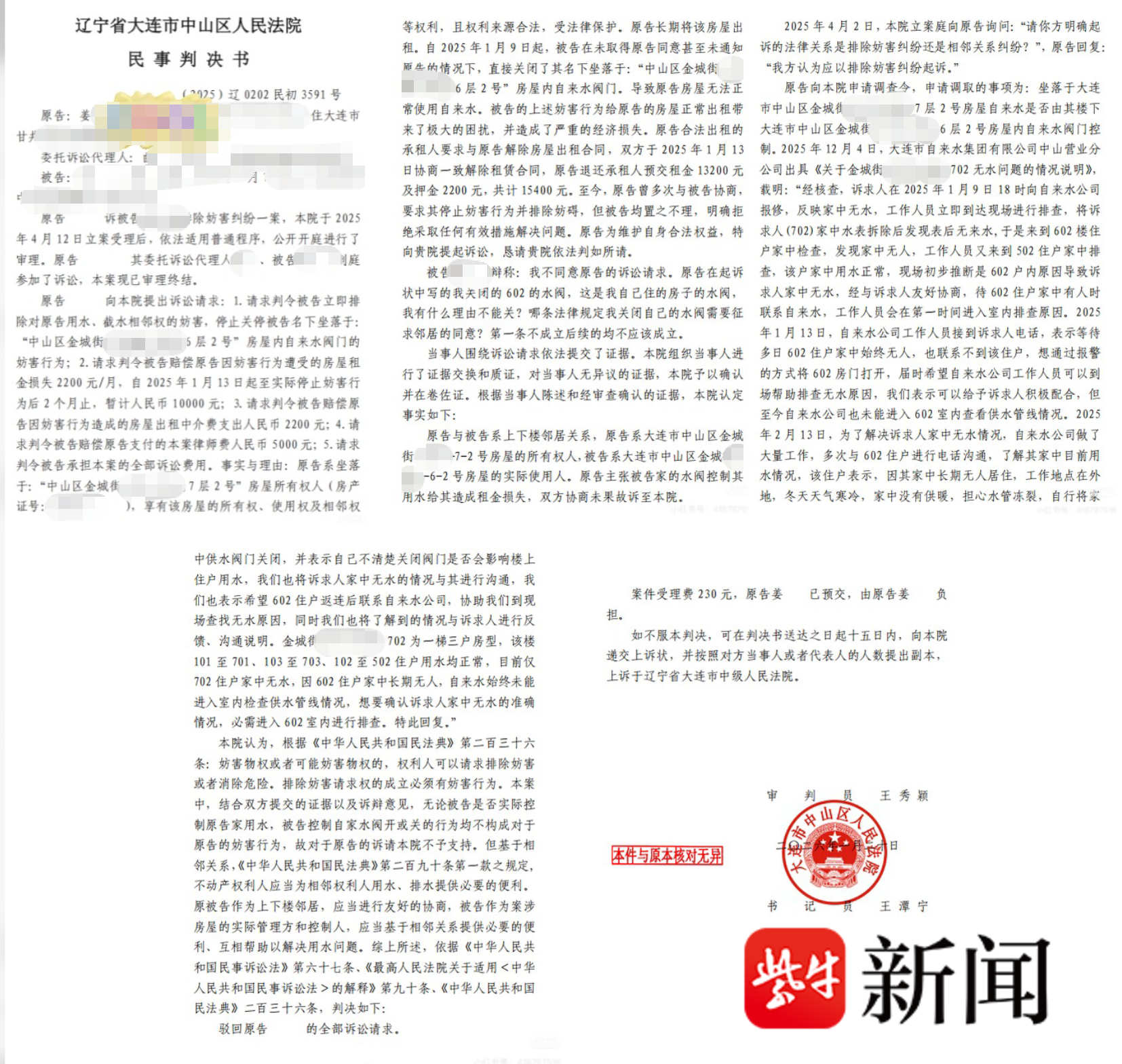 2026年1月20日,大连市中山区人民法院作出一审判决。据姜女士提供的法院判决书显示,自来水公司2025年12月4日出具的情况说明证实,2025年1月9日姜女士报修后因602室无人无法入户检查;1月13日姜女士提出报警开门排查,自来水公司愿意配合但未实施;2月13日工作人员与602业主电话沟通得知,其因长期在外地、家中无供暖,为防止水管冻裂关闭水阀,且不清楚该行为会影响楼上用水。