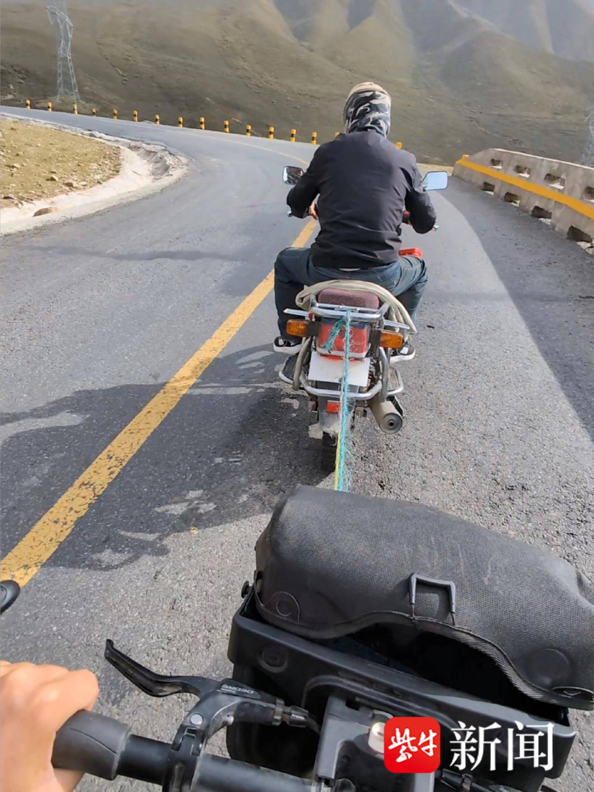 在青海翻越一座高山垭口时,一位藏族小伙子坚持骑摩托用绳子拉着他上坡!“更让我惊讶的是,到山顶后他立刻掉头下山——原来他根本不是同路,只是专门跟上来帮我!”