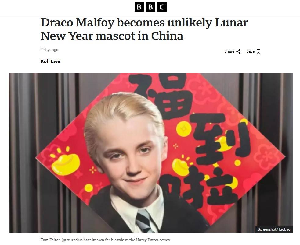 费尔顿很快注意到了,转发了中国商场的“马尔福”巨幅海报,并且配文说:“德拉科成了中国新年的象征。”
