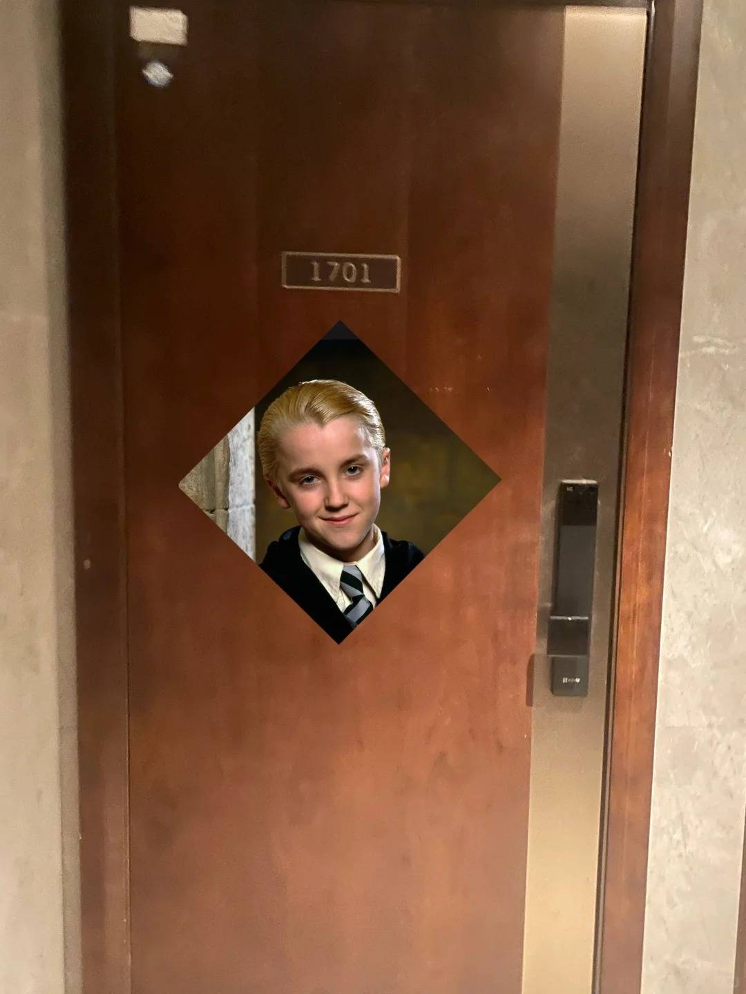 而且巧合的是,马尔福的中文名字既有“马”,又有“福”,文刀李来了灵感,就站起来随手拍了一下家门,然后用手机处理了一下,把带着一丝坏笑的马尔福照片做成菱形的福字头模样粘贴到门上,发到了小红书。