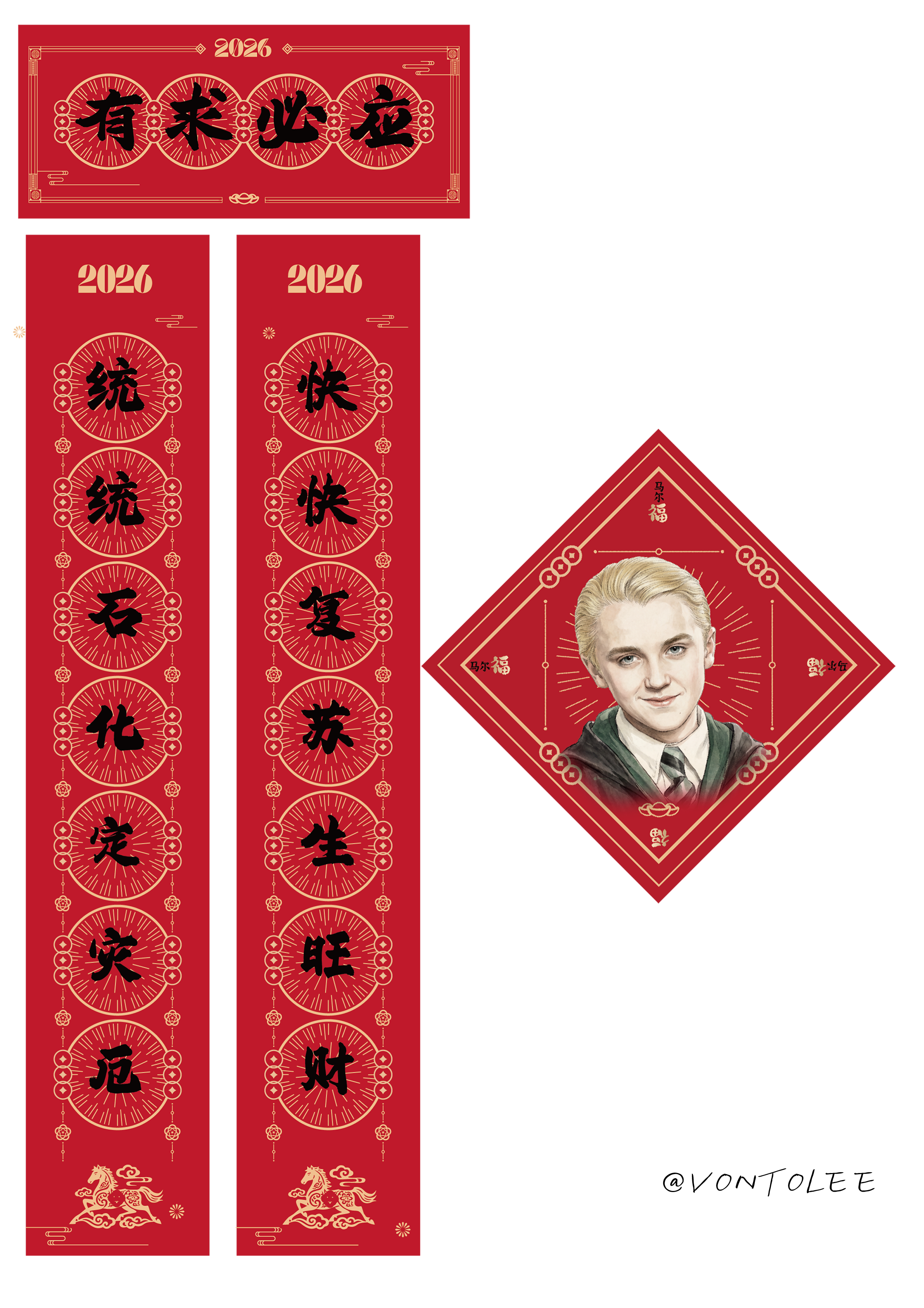 看到大家都很喜欢这个创意,文刀李再接再厉,干脆根据马尔福的人物设定做了一套春联和福字头,上联是“统统石化定灾厄”,下联是“快快复苏生旺财”,横批“有求必应”,还有一个马尔福坏笑的福字头,一起发了出来。“我希望通过这几个作品,可以引导大家做更大胆的创意。”